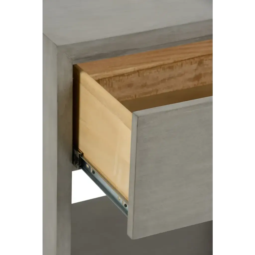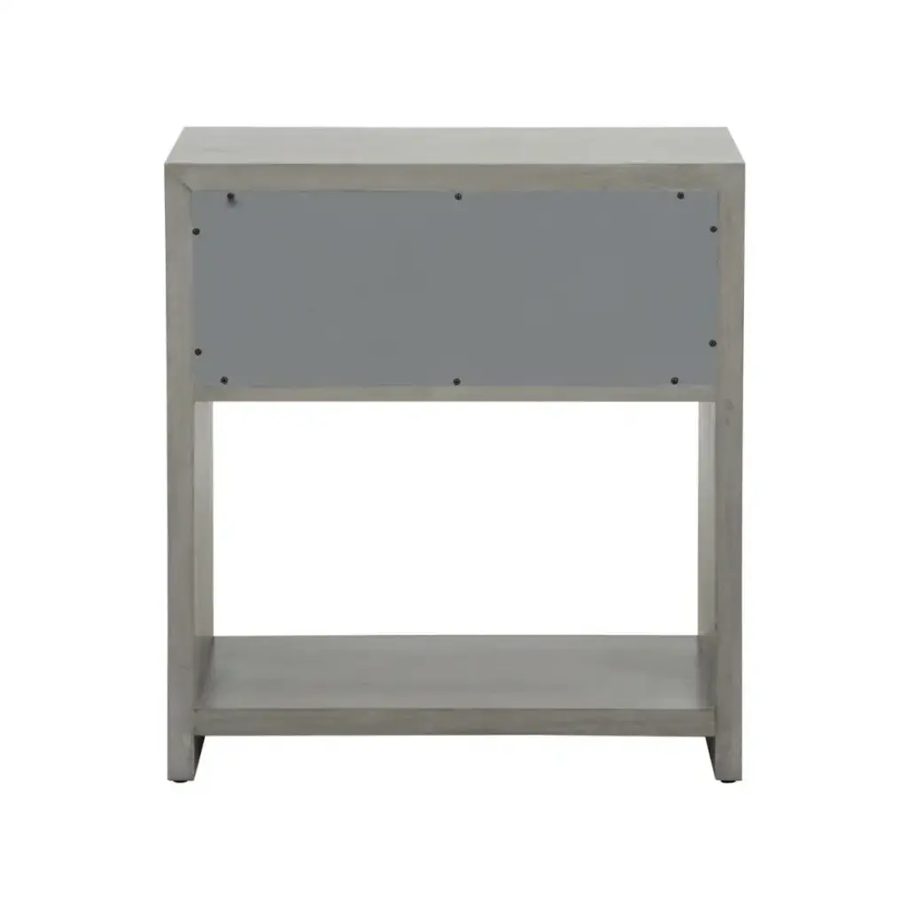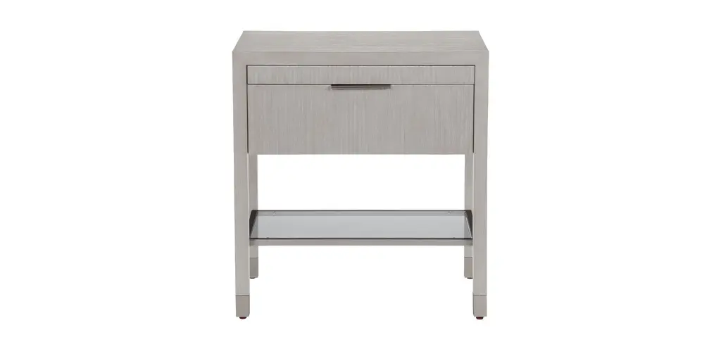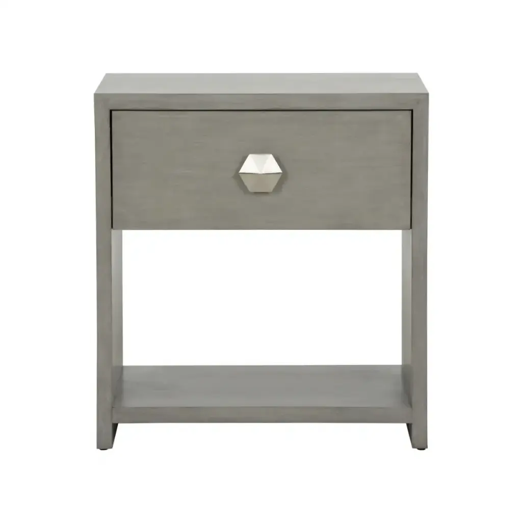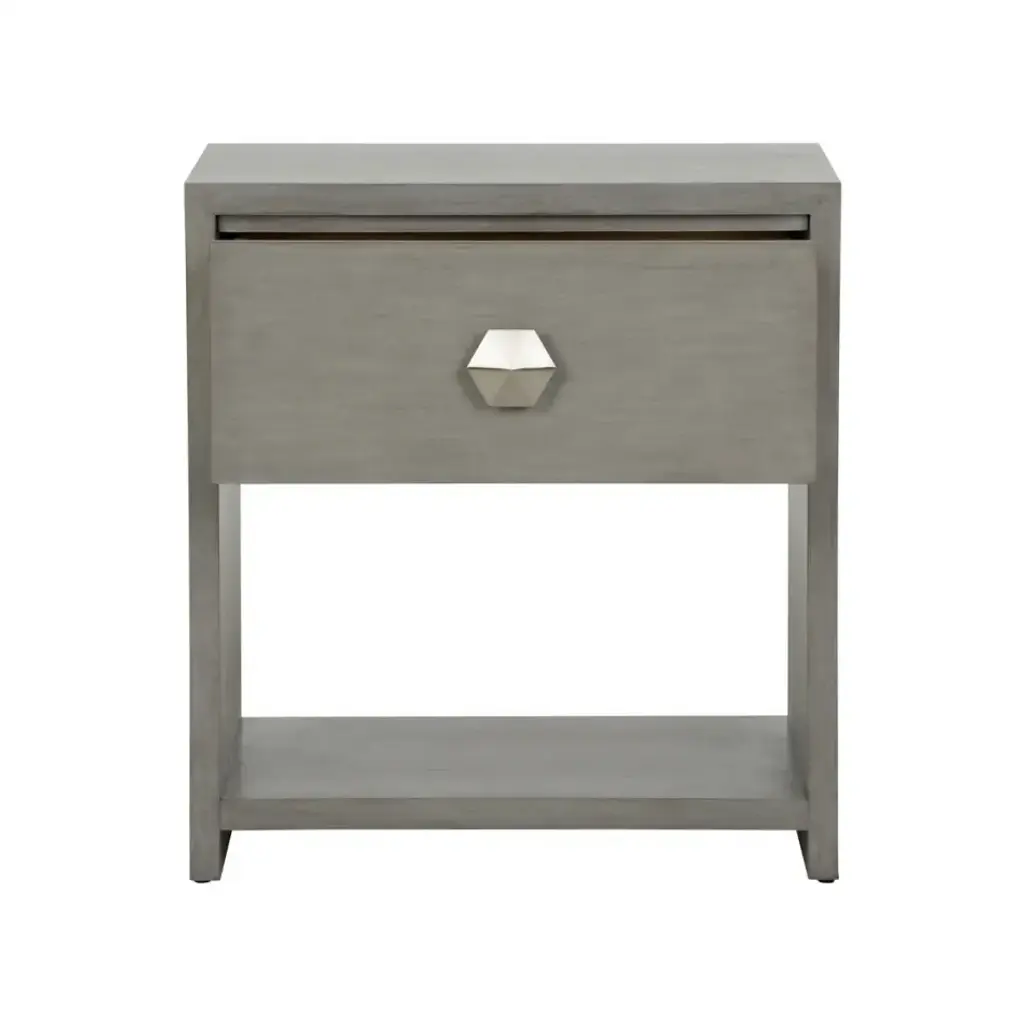 Display treasures or place a drink on the stunning Moxy Bedside Table. Finished in a lovely gray with geometric silver hardware, the storage space below offers plenty of room. Perfect to use as a side table or even as a nightstand for simplistic elegance. Designed by Elizabeth Wicker.