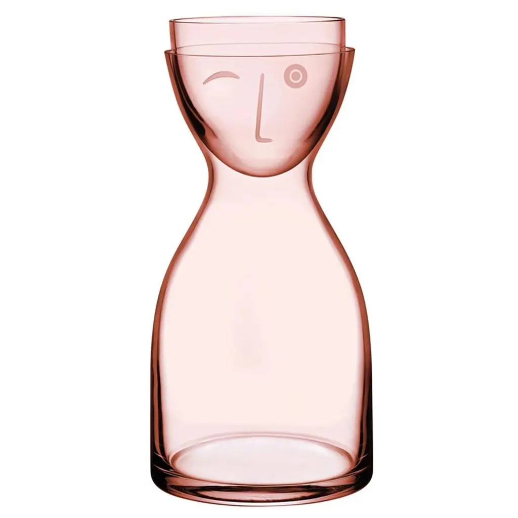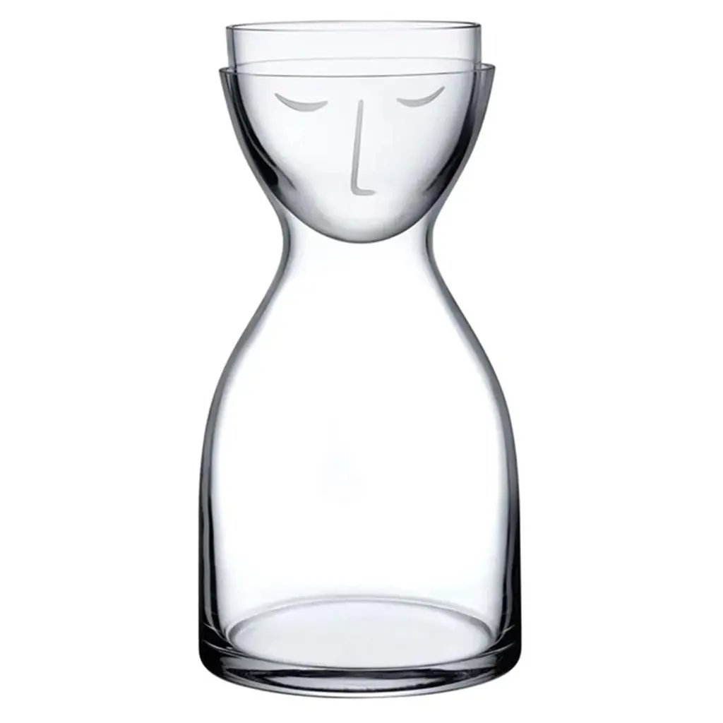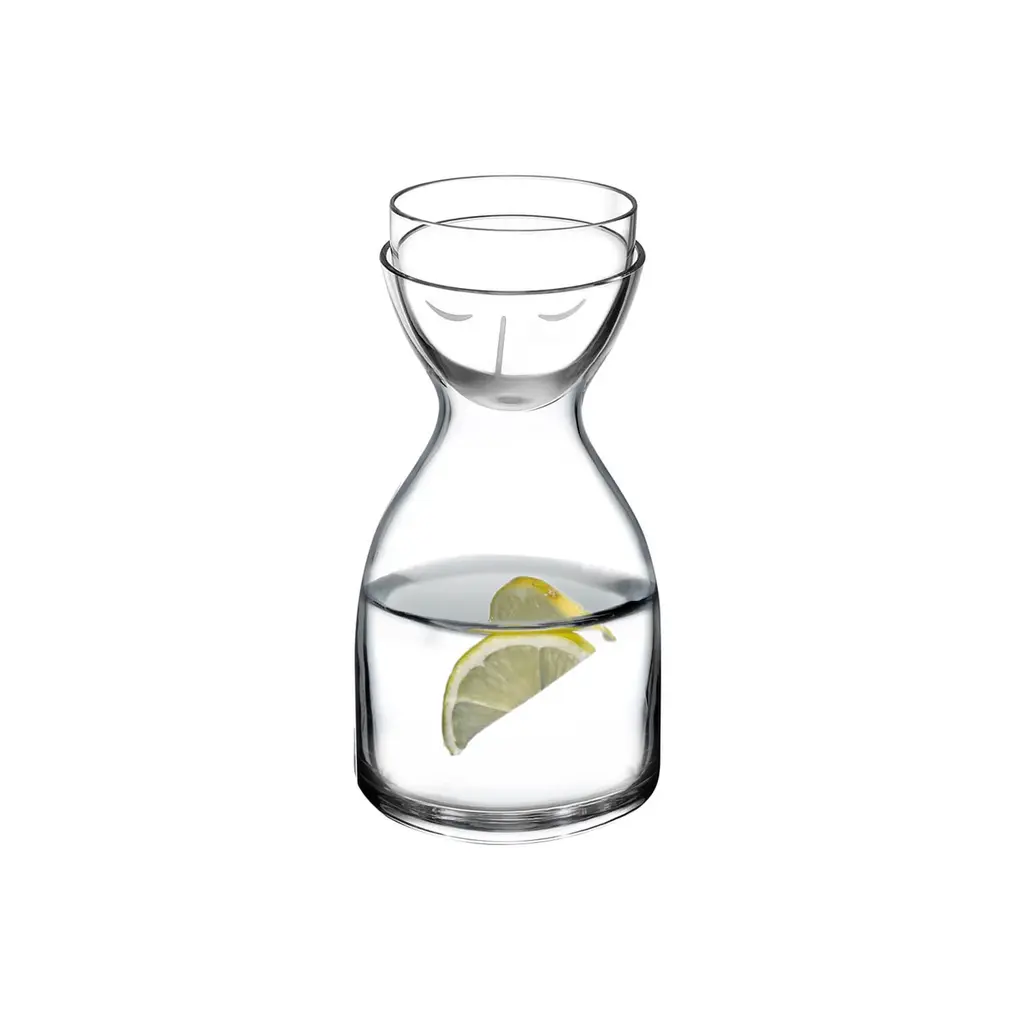 A chic carafe for bedside hydration, the Mr. & Mrs. Night Water Set from Nude Glass is an elegant and playful beverage server. Handcrafted from mouth-blown glass, the drinking cup doubles as a bottle lid and is adorned with a cute sleeping or winking motif. Designed for bedside refreshment in a residential setting, the drinking glass has a rounded base to return to its top spot. Perfect as a wedding gift! Highlights