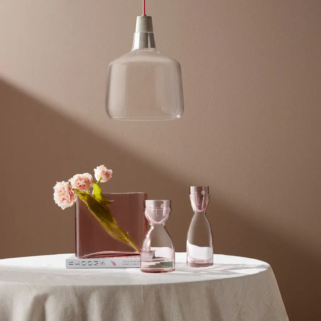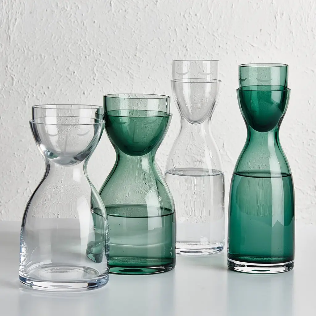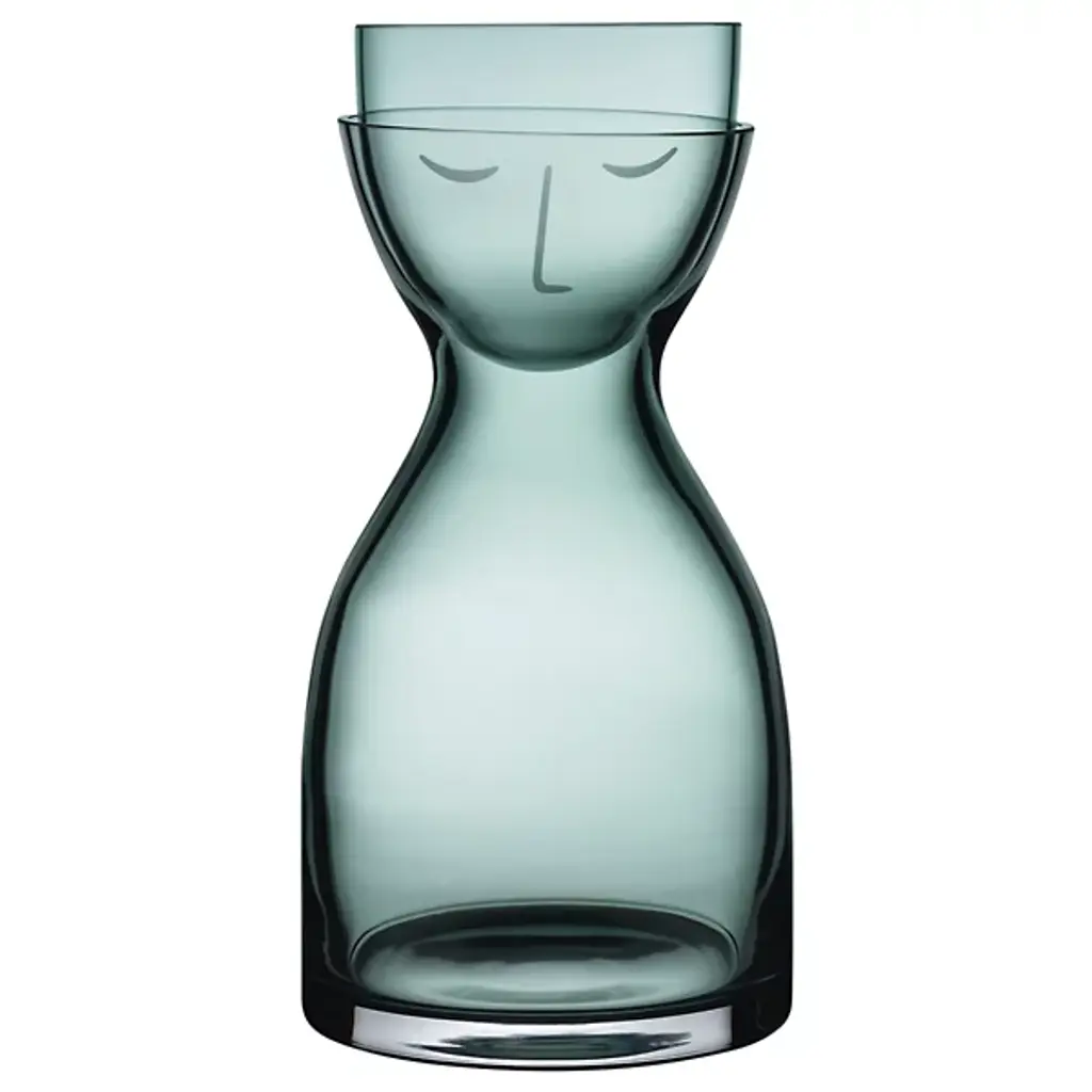 A chic carafe for bedside hydration, the Mr. & Mrs. Night Water Set from Nude Glass is an elegant and playful beverage server. Handcrafted from mouth-blown glass, the drinking cup doubles as a bottle lid and is adorned with a cute sleeping or winking motif. Designed for bedside refreshment in a residential setting, the drinking glass has a rounded base to return to its top spot. Perfect as a wedding gift! Highlights