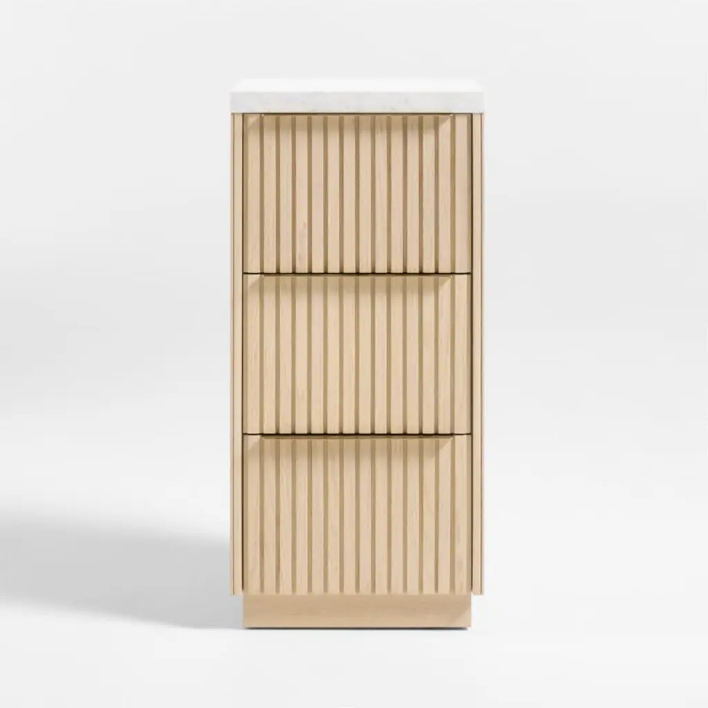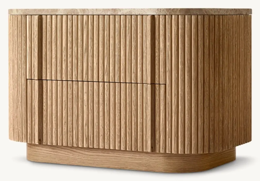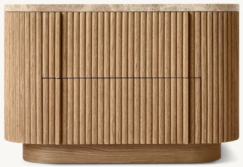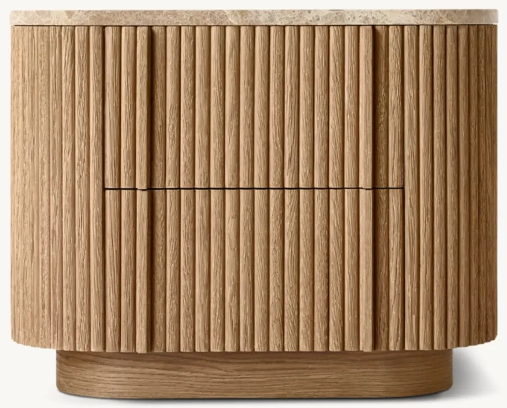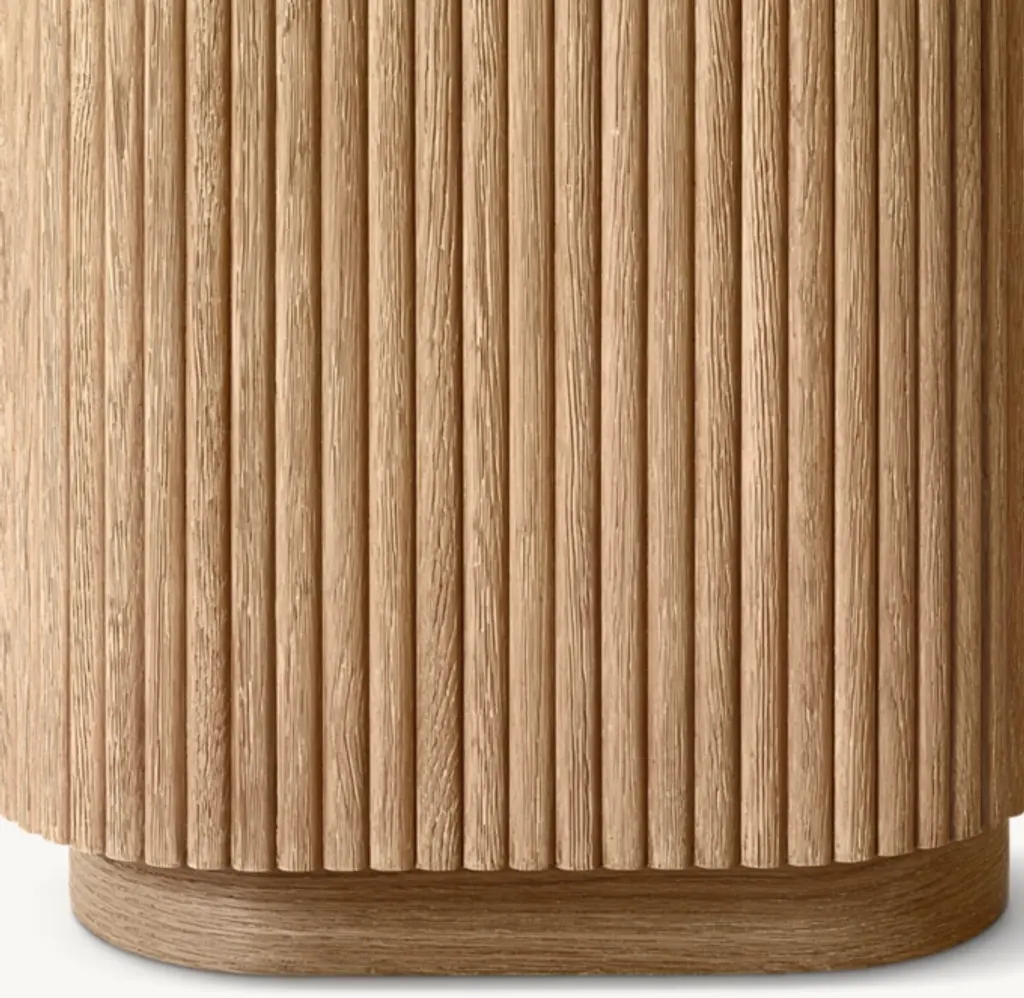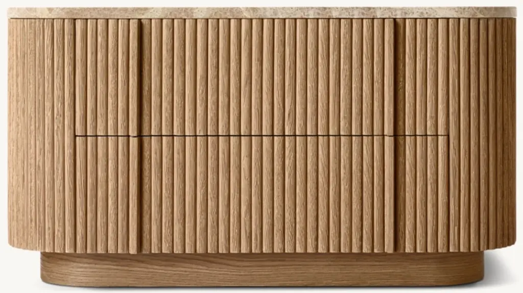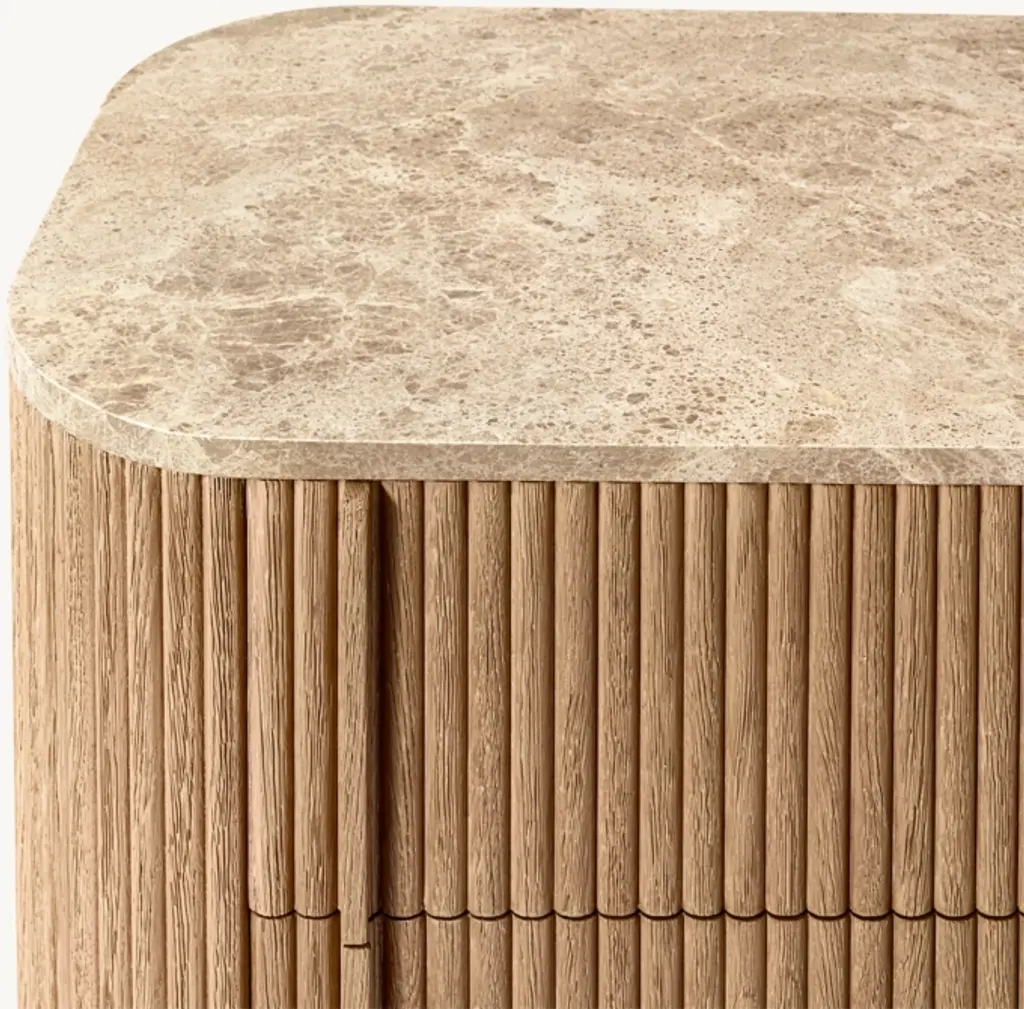 Defined by individually applied reeds of wire-brushed solid American white oak, Mulholland is the creation of celebrated design team Thomas Bina and Ronald Sasson. The collection features radius corners that curve around the side for an uninterrupted, fluid silhouette. Crafted of Emperador marble, the top is replete with rich veining and striking color contrasts that make each piece unique. SHOP THE ENTIRE COLLECTIONEXPLORE ALL REEDED COLLECTIONS