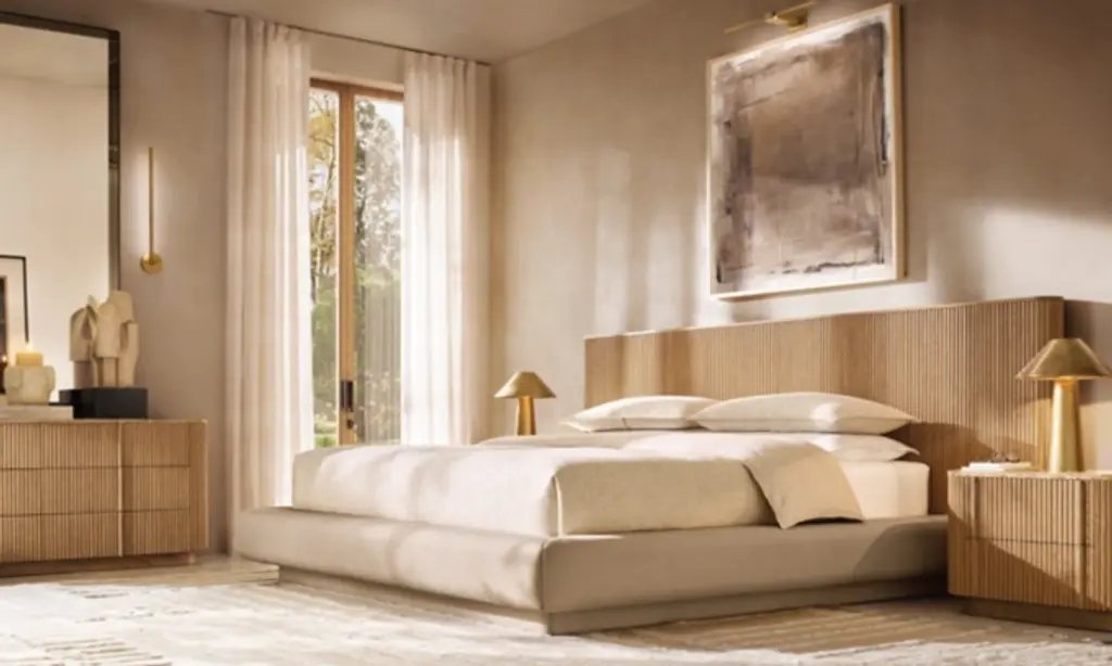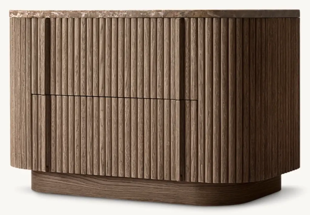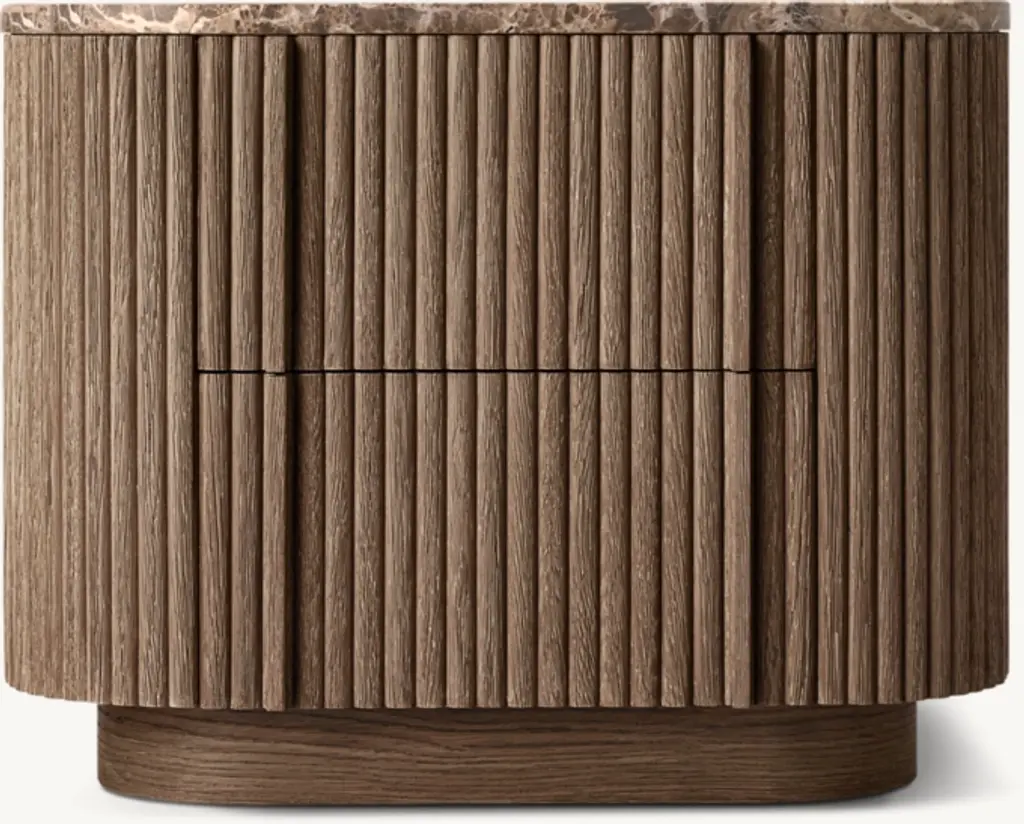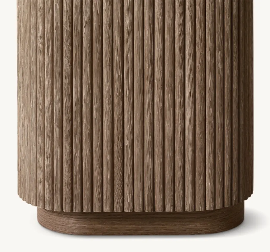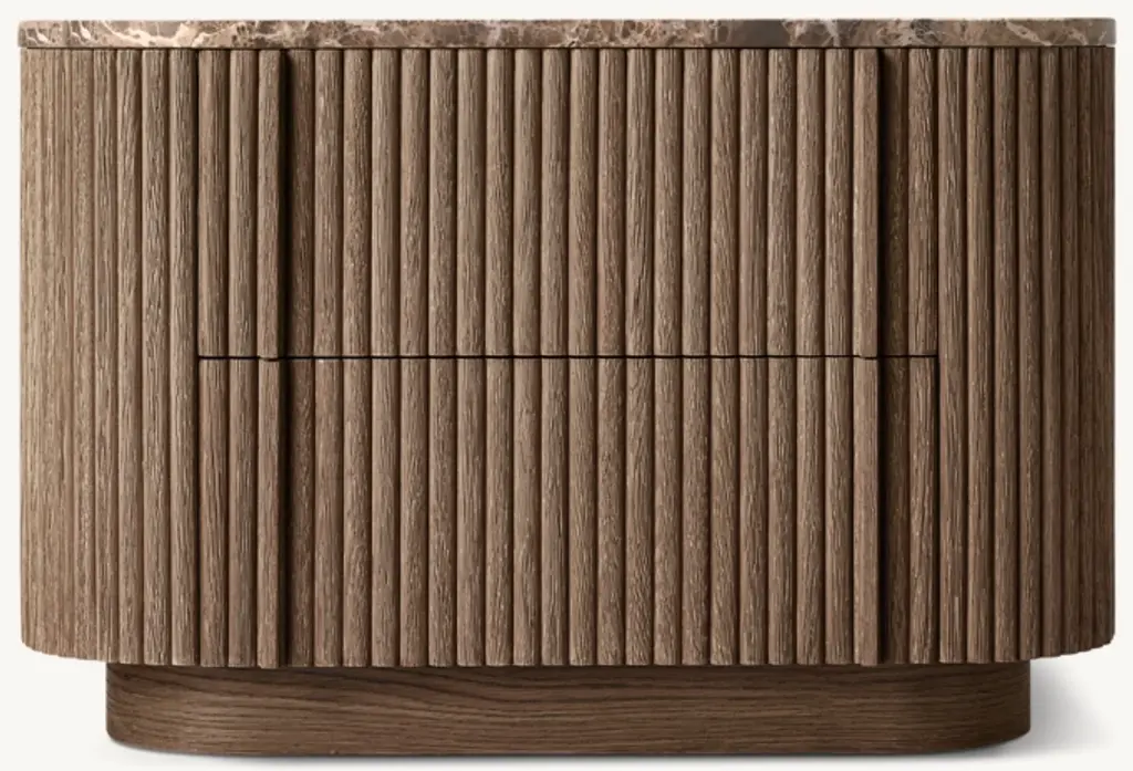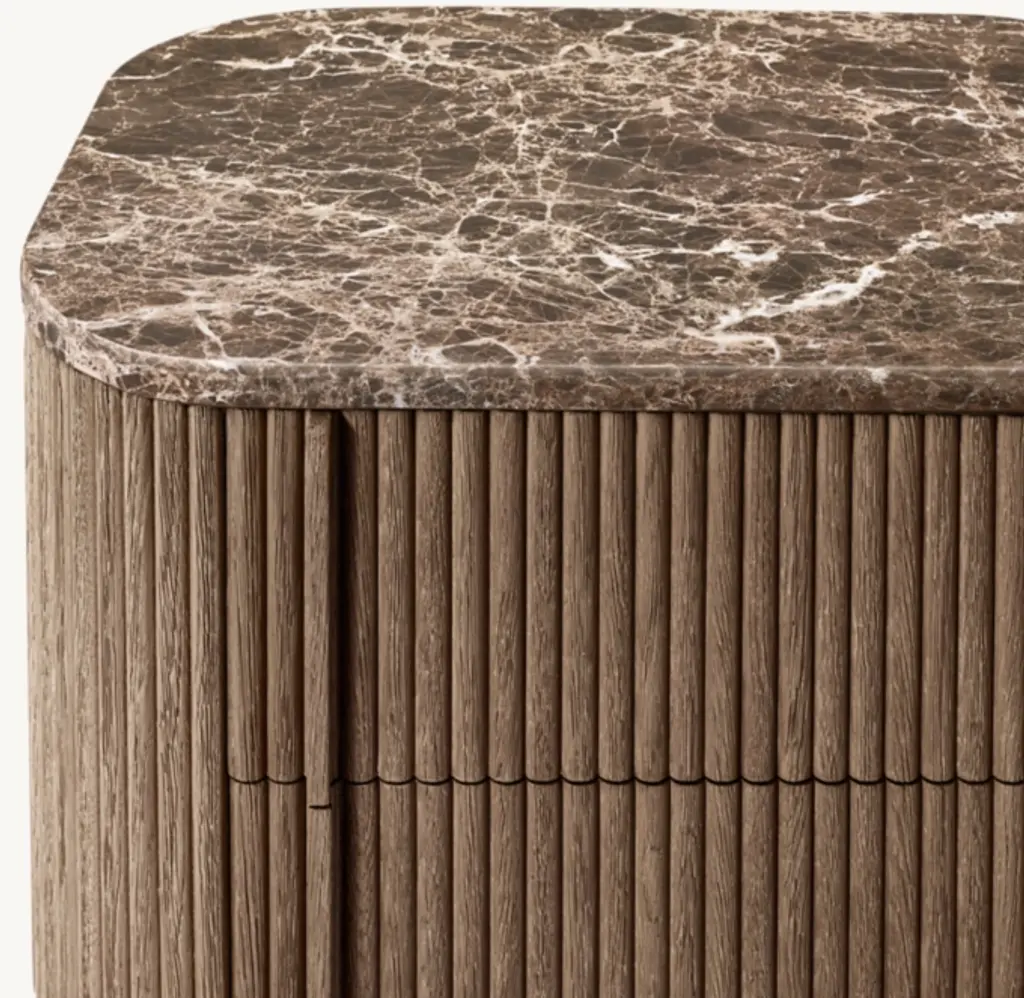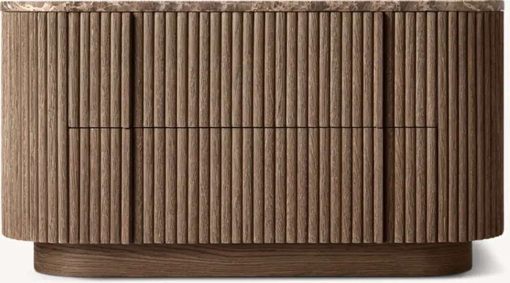 Defined by individually applied reeds of wire-brushed solid American white oak, Mulholland is the creation of celebrated design team Thomas Bina and Ronald Sasson. The collection features radius corners that curve around the side for an uninterrupted, fluid silhouette. Crafted of Emperador marble, the top is replete with rich veining and striking color contrasts that make each piece unique. SHOP THE ENTIRE COLLECTIONEXPLORE ALL REEDED COLLECTIONS