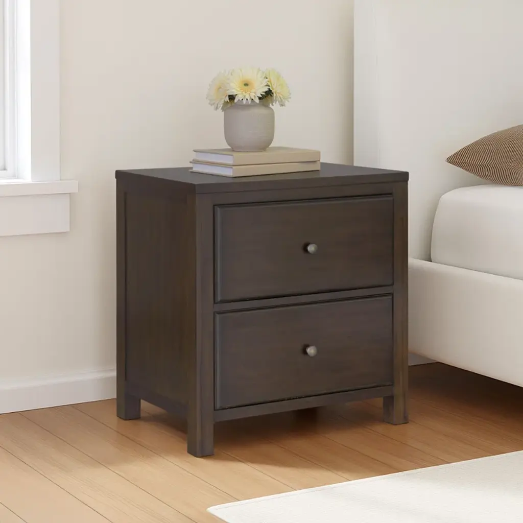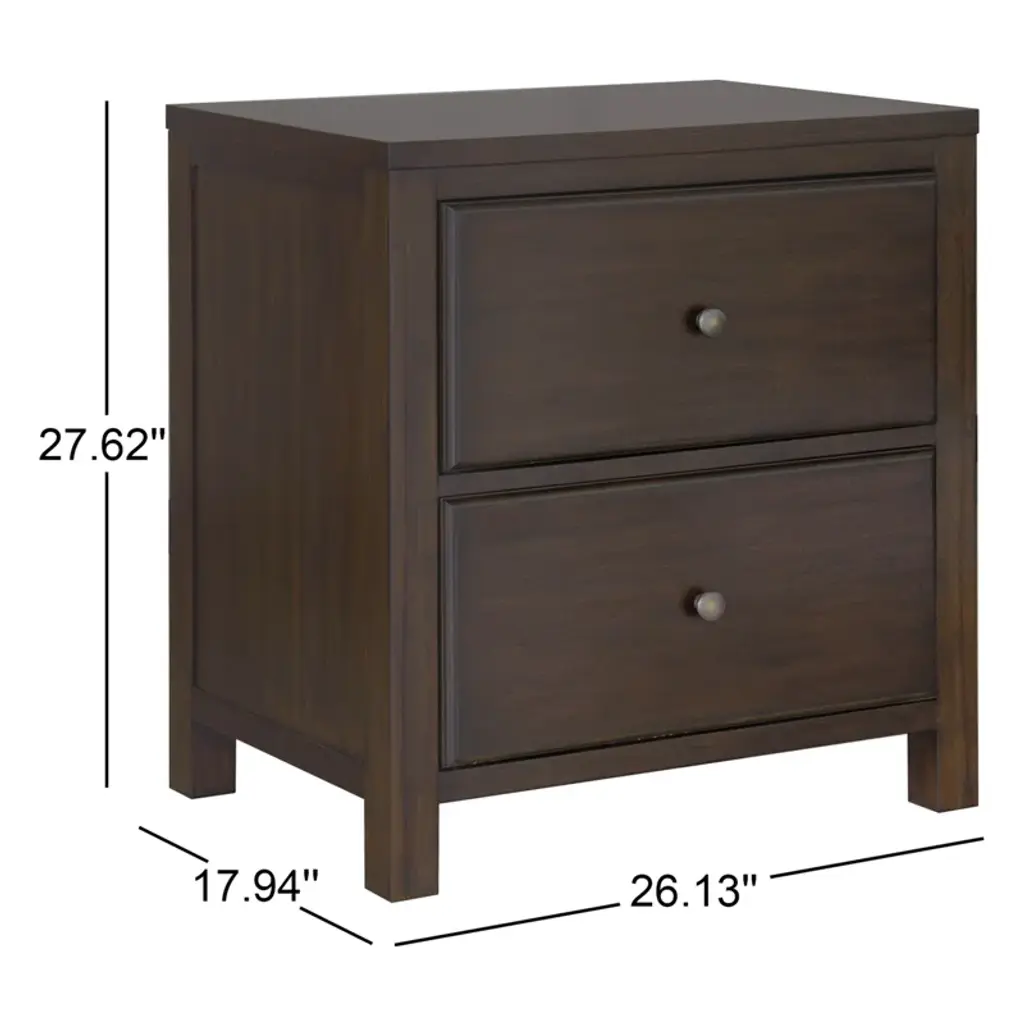 When it's time to curl up in bed at night, or if you want to stay in it just a little bit longer than usual on Sunday morning, you need the essentials close by because staying cozy is the goal. With this solid wood nightstand, keep everything within easy reach. Sturdily crafted from solid mahogany wood in a mocha finish, this bedroom nightstand's two drawers with aged brass knobs glide easily and offer great storage for remotes, devices, and more. Plus, the top surface is the perfect spot for a reading lamp and your latest page-turner. No assembly is required.