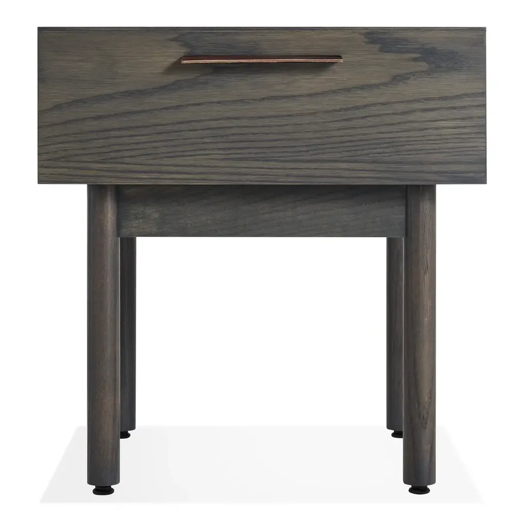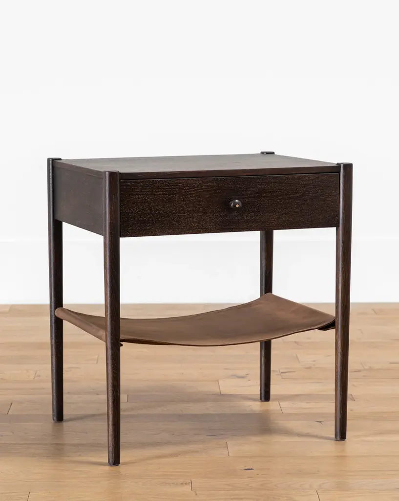 Crafted from oak in a dark brown finish, our Nathan Oak Nightstand is refined and subtly textural. A loose top grain leather shelf perfectly complements the simple drawer with its small round pull. The moody tones and natural materials of the nightstand bring a sophisticated feel to bedroom styling.