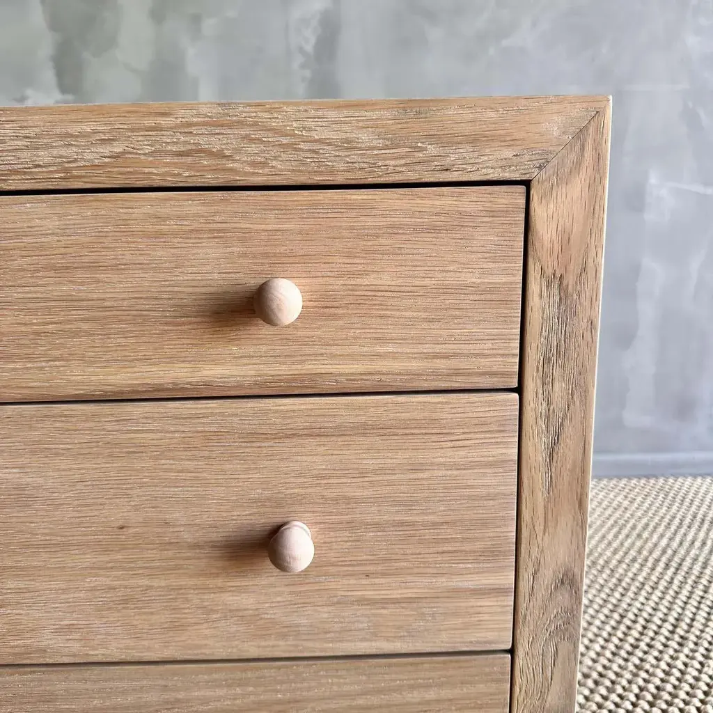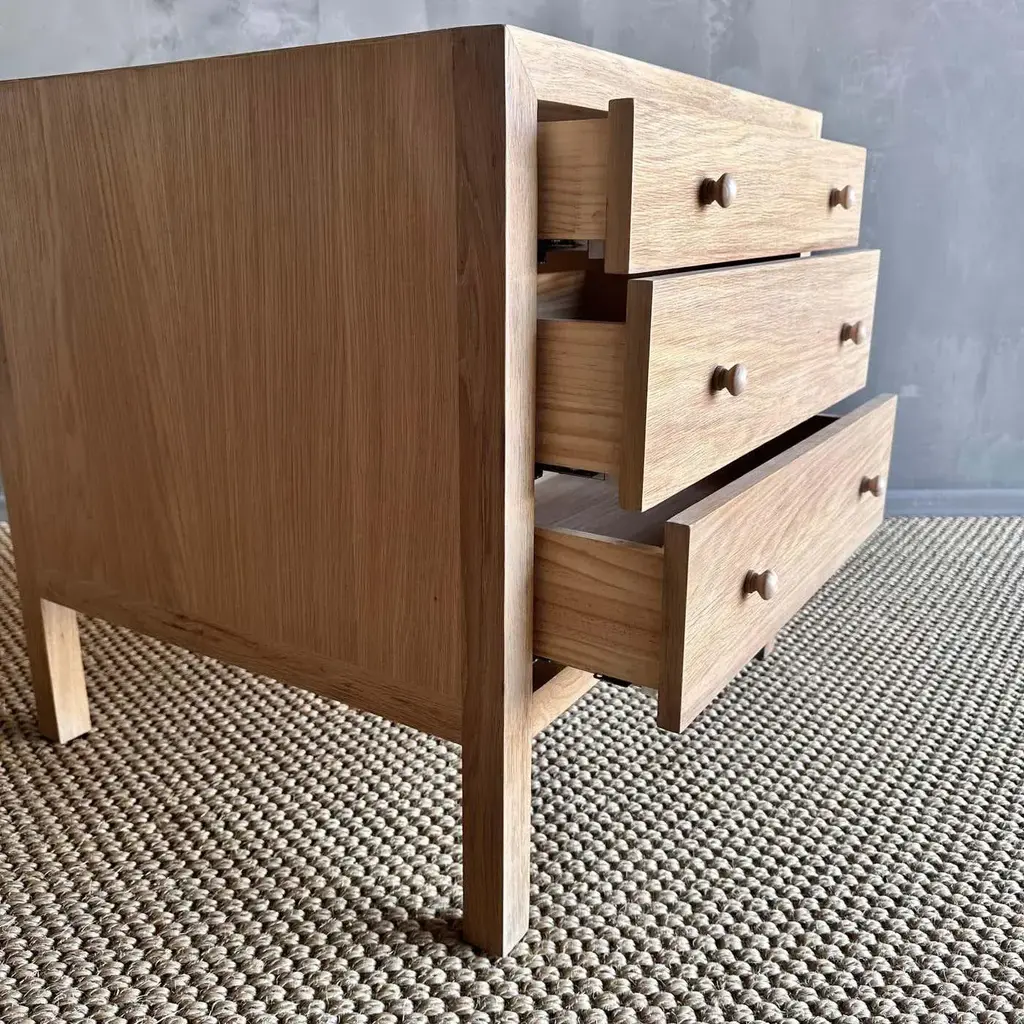 The Harper 3 drawer nightstand in white oak is the perfect choice for those looking to add a contemporary flair to their bedroom. The finish of the white oak wood brings a sense of warmth and sophistication to any space. The 3-drawer provides ample storage for all your bedside essentials, keeping your bedroom clutter-free and organized. Wood: White Oak Finish: L115 / Natural / Oiled Finish Size: 26″ w x 21″ d x 26″ h Drawer size: 23″ w x 4″ h top drawer x 6″ h drawers #2, #3 Soft close mechanisms contrasting oak knobs/ can be easily removed to add your own personal touch!