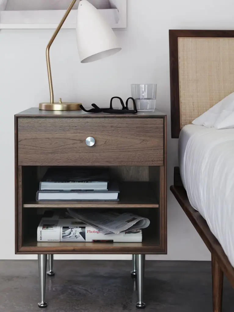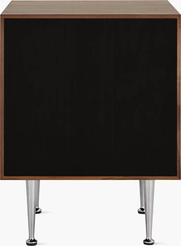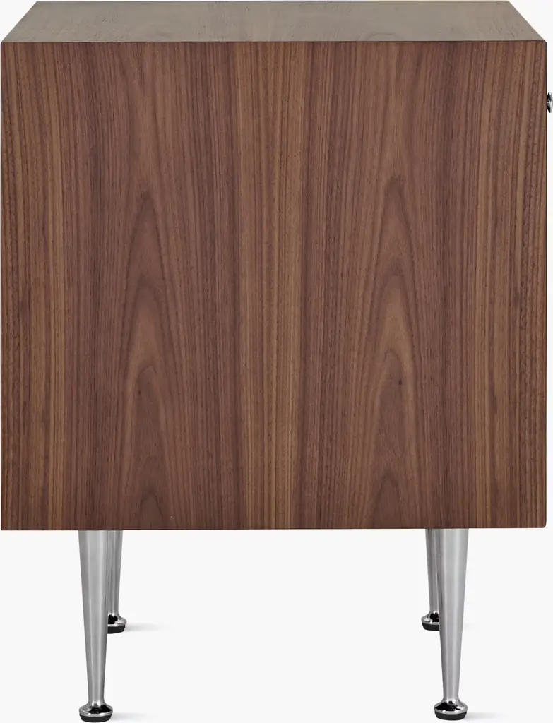 George Nelson's Thin Edge Collection (1952) was first called the Rosewood Case Series. Manufactured today with environmentally sustainable veneers and 85% recycled materials, Thin Edge leverages the latest manufacturing technologies without compromising the design's original look and feel. This is the authentic Thin Edge Bedside Table by Herman Miller.