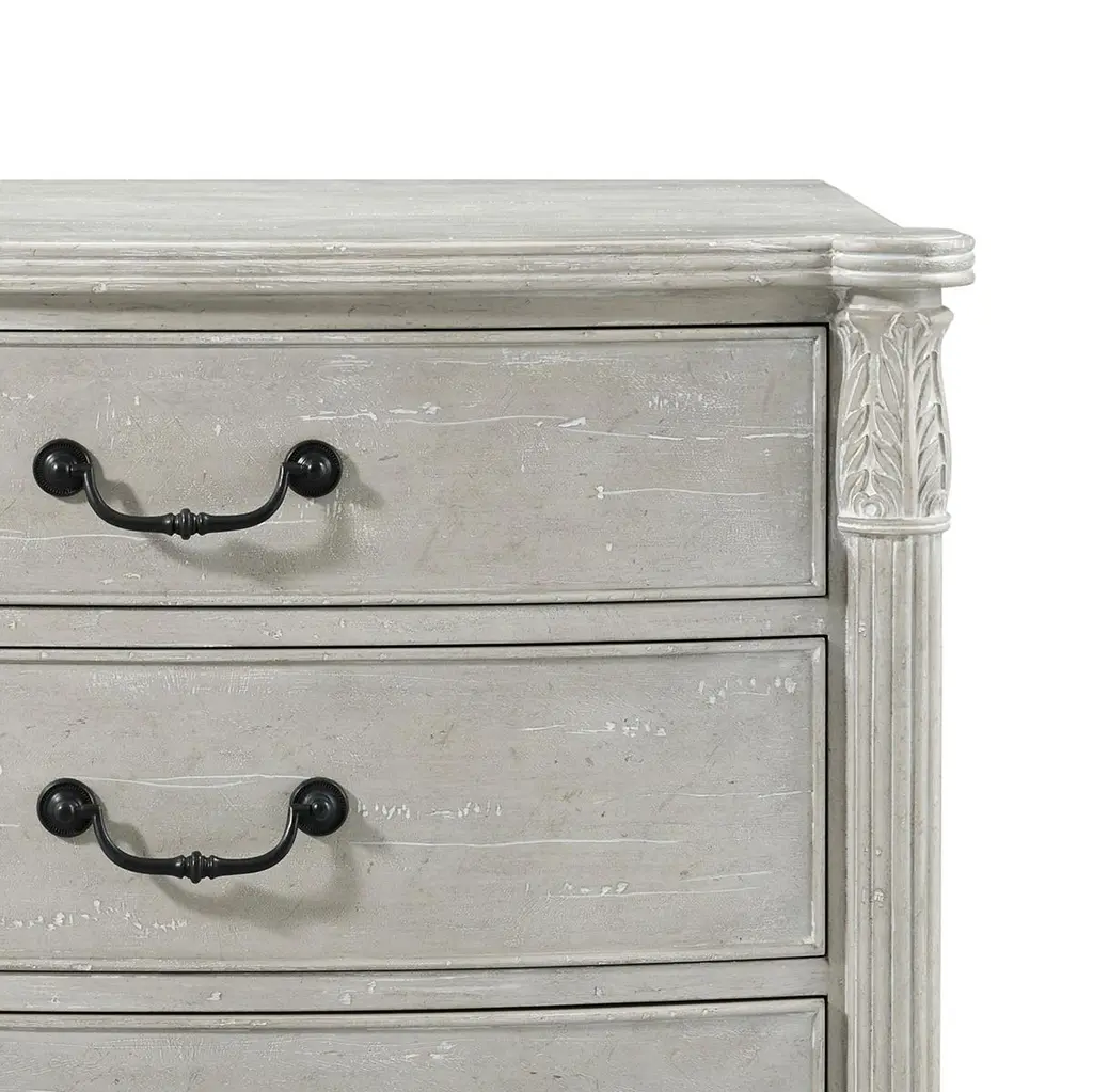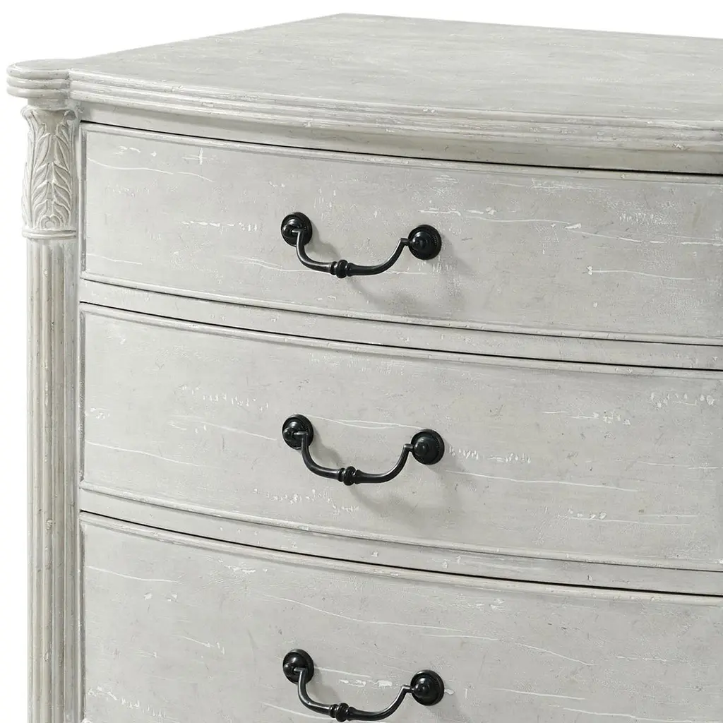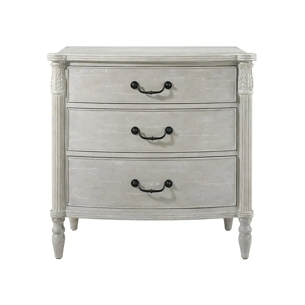 A stunning blend of timeless design and modern craftsmanship. In a Limestone hand-painted finish, the reeded edge bowfront top, with distinctive protruding turret corners, adds architectural elegance, while the acanthus leaf-carved and reeded uprights introduce a touch of artistry. Three graduated drawers, adorned with verdigris brass handles, offer ample storage and vintage charm. Raised on turned legs, this piece is as functional as it is stylish, making it a perfect addition to luxurious interiors.Dimensions: 30" W x 20" D x 30" H