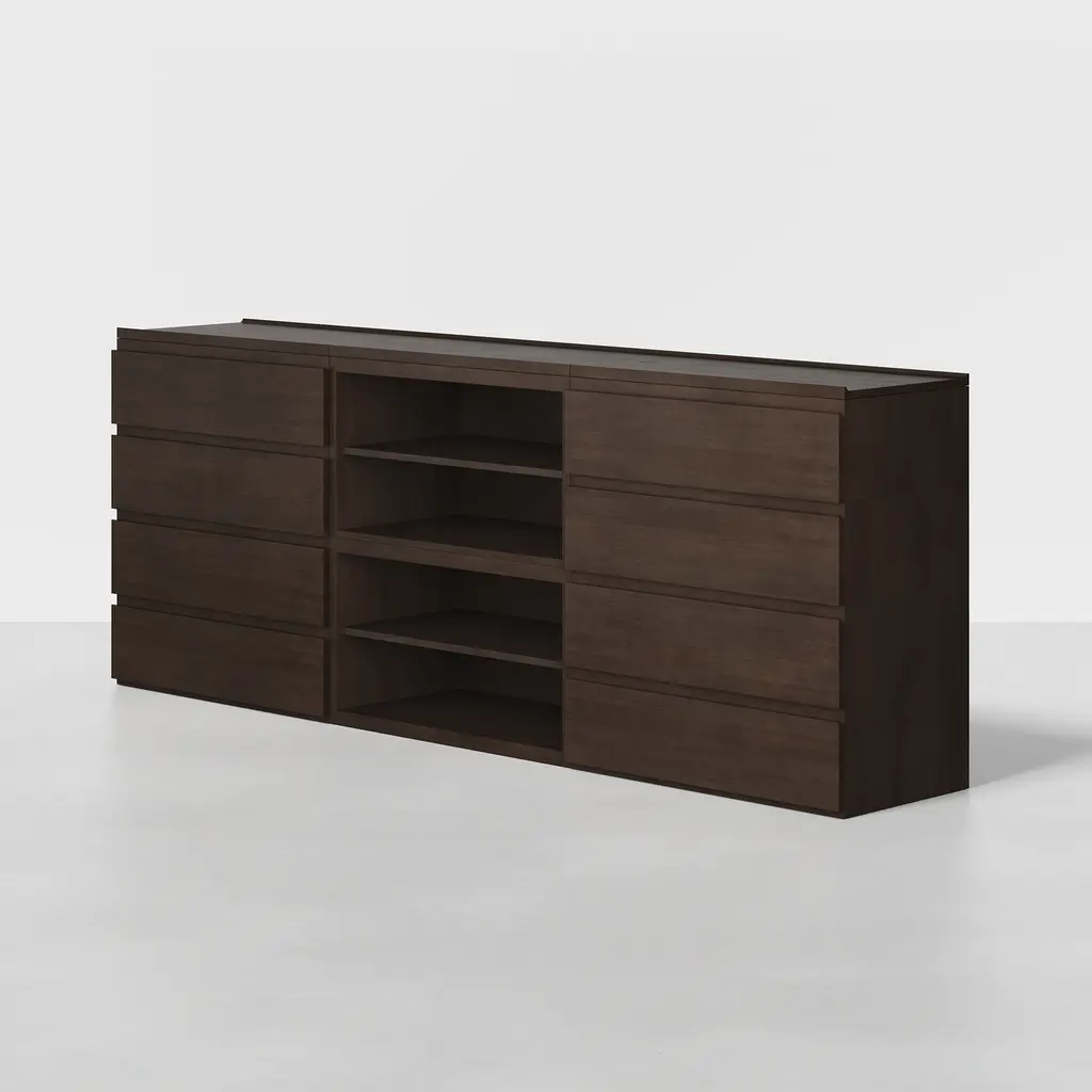 A highly functional centerpiece, made from solid, upcycled wood. The Nest Credenza anchors any room and provides space to display and stow. Versatile low-profile design can also be purposed as a media console or sideboard. Do not stack higher than 47" max. Compatible with the Nest Dresser, Nest Shelving, Nest Nightstand Open, Nest Shelf, and Nest Drawer.