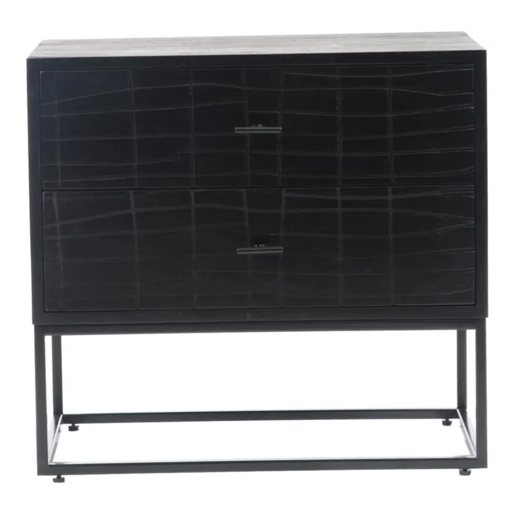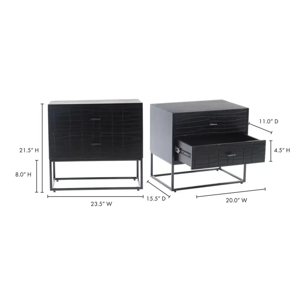 A slick look. The Atelier nightstand features two sliding drawers with a textured front. A cool iron frame supports this minimal stand. The ideal stylish spot for a complementary lamp, candle, or cup of tea.