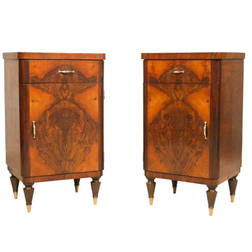 Italian by Gaetano Borsani, 1920s Art Deco nightstand veneered burl walnut with golden brass handle and foot. We have the pair of bedside tables, one right and one left with its dresser. Polished with wax finish.Measures nightstand in cm: H 76 x L 43 x P 36.Gaetano Borsani, with his Atelier di Varedo was a noted furniture craftsman, father of the designer Osvaldo Borsani where he worked at the beginning of his career.