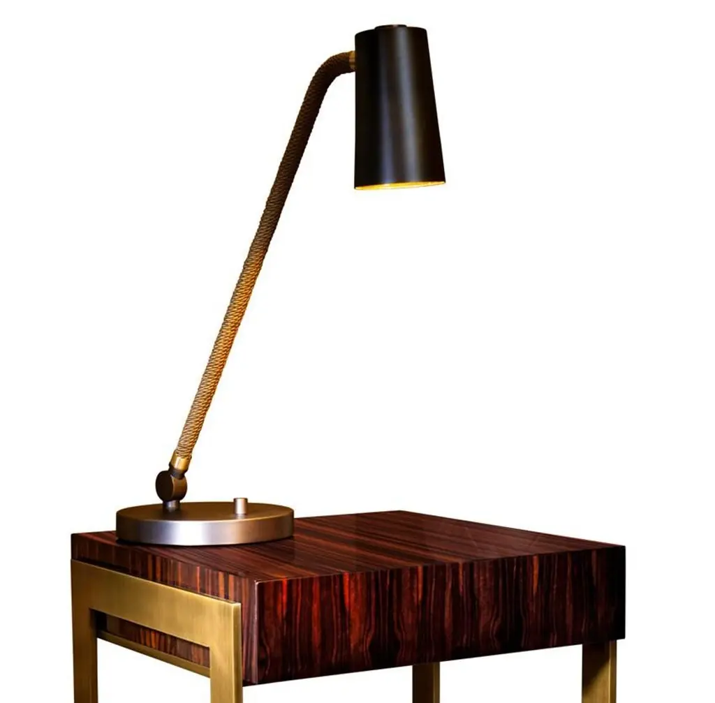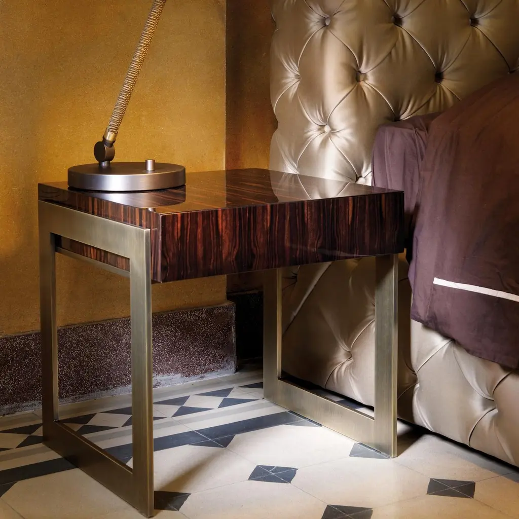 This luxurious bedside table features a bold combination of contrasting colors, textures, and patterns within a frame that is linear and Minimalist, revealing an intriguing design that will infuse sophistication in a modern bedroom. The structure it tall and light, made of two thin rectangular silhouettes in bronzed metal. They support a top with a drawer in prized Macassar ebony for a precious accent. Bold and refined, this is the perfect addition to both an elegant home and a luxury hotel.