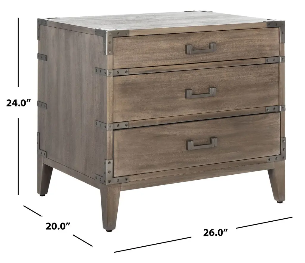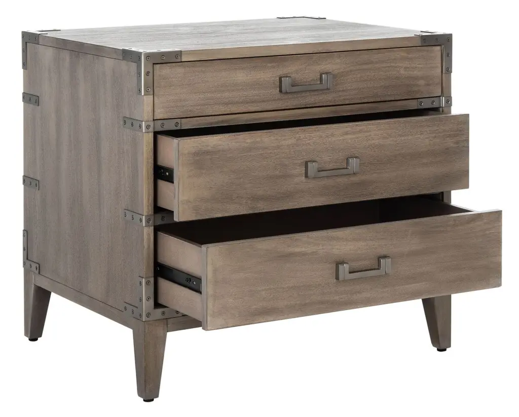 This stunning Nirel Nightstand is a perfect pairing of industrial sass and couture class. Inspired by campaign style steamer trunks, Nirel’s antiqued hardware and nailhead details give its mahogany frame a fashion-forward edge, while three drawers provide ample bedside storage.