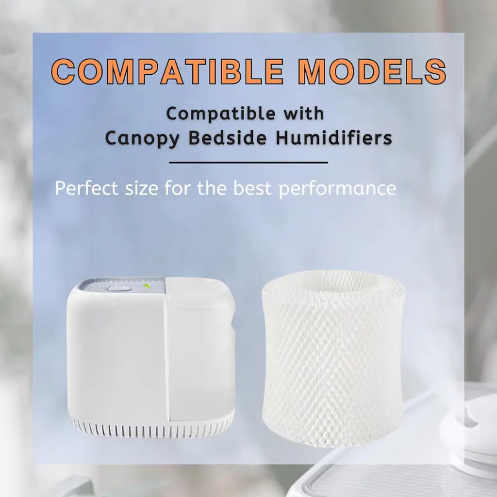 A premium humidifier wick filter designed by Nispira. Replacement Humidifier Wicking Filter replacement for Canopy Bedside Humidifier. The humidifier filter replacement features a premium reinforced mesh design that effectively captures hard minerals in water, preventing white dust from circulating in indoor air. Made with Wood Pulp, Paper Filter. Cutting-edge technology enhances moisture absorption and output, boosting efficiency and creating a fresh, comfortable environment. This reduces the impact of dry throat, dry skin, and other related discomforts. 2 Filter Included, Dimensions: 5.25 x 0.65 x 5.75 inches. Tip: Use distilled water for best results and replace filters every 1-2 months, depending on usage.