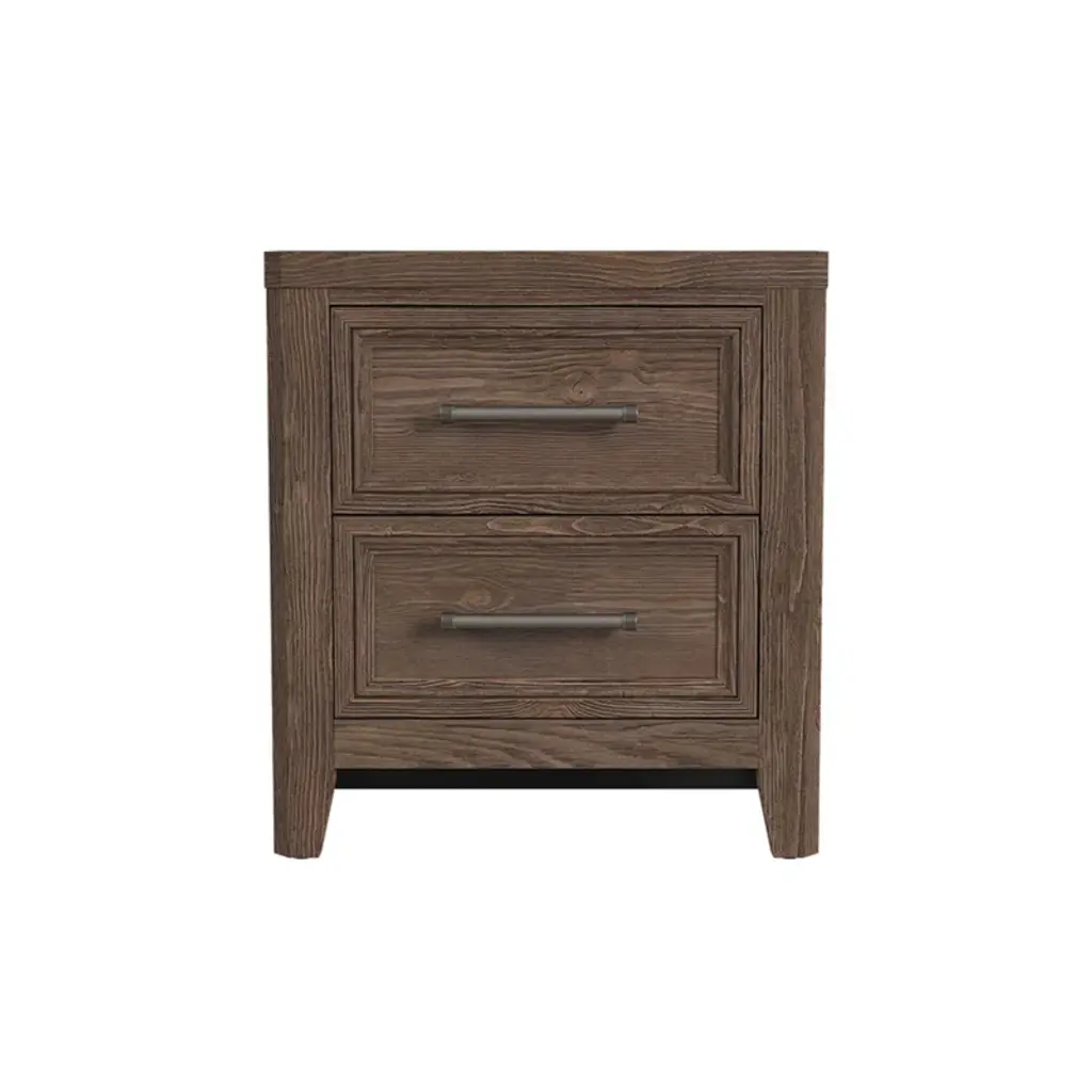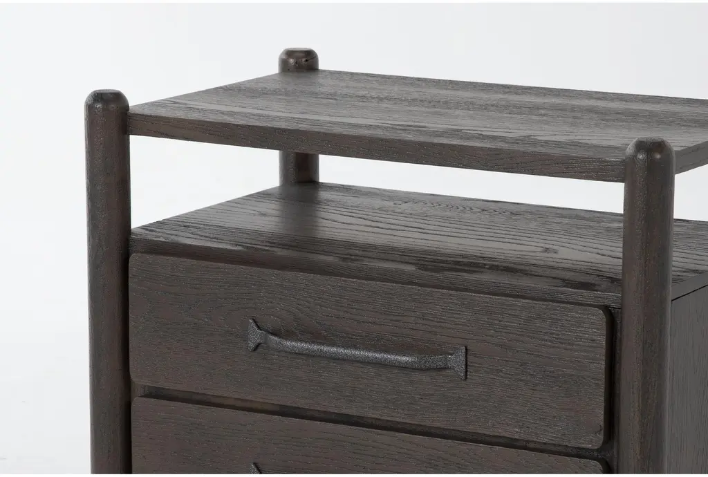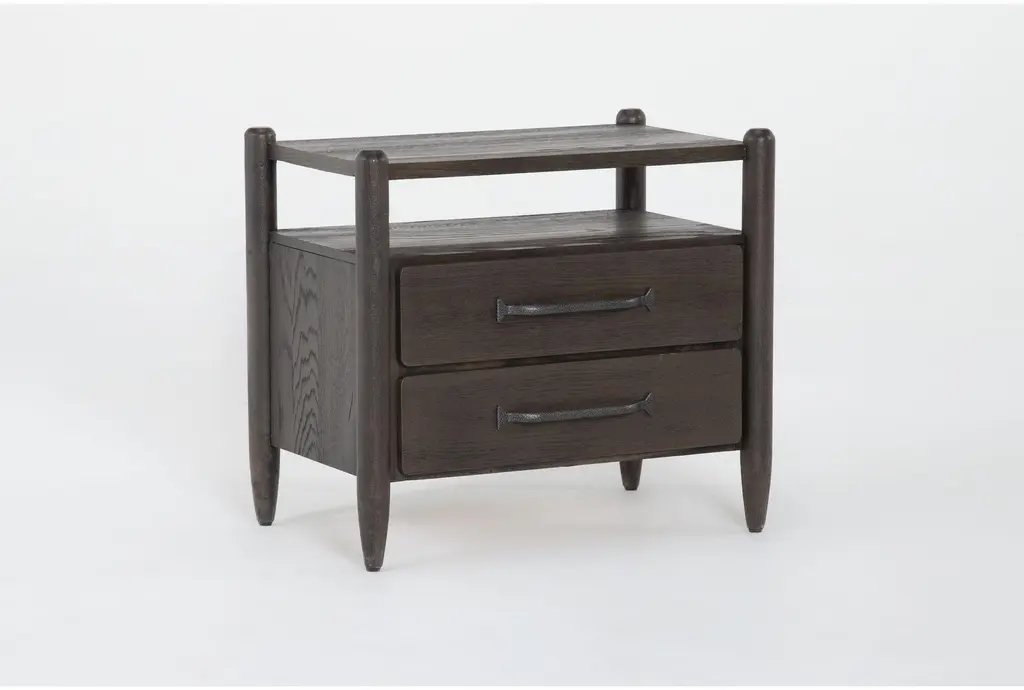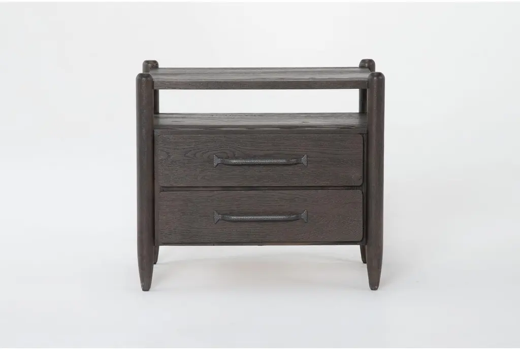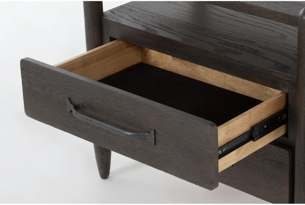 With its modern farmhouse look that combines elements of old and new, our Nomad nightstand revives the charm of discovered antiques and found objects for today's interiors. A combination of solid oak and oak veneer in a multi-step warm brown finish gives this design rich, distinctive appeal. While custom hammered metal hardware adds industrial detail, gracefully turned posts lend an air of elegance. It even includes USB ports for easy, convenient charging.