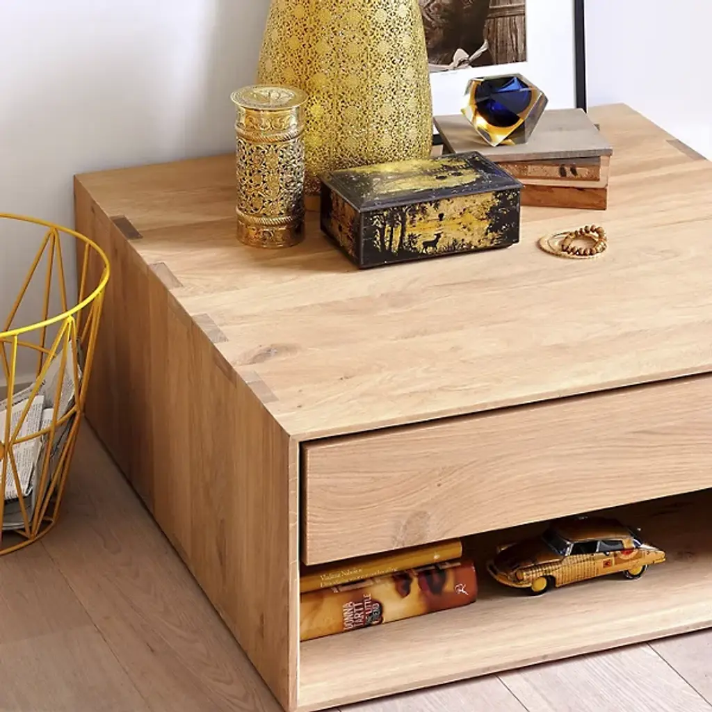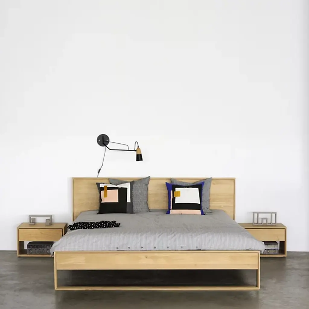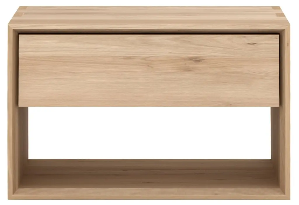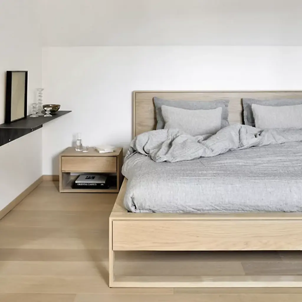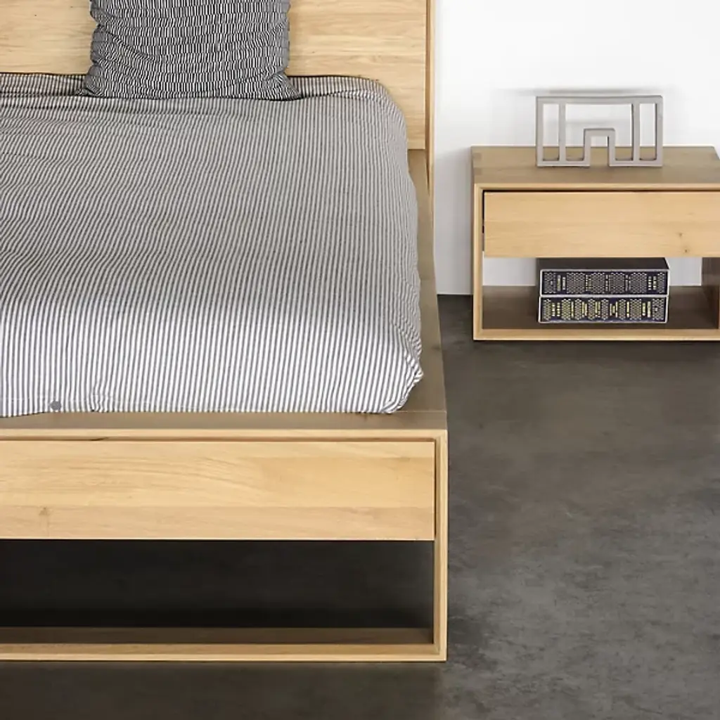 Easy breezy, simultaneously low to the ground and far above it, the Nordic Bedside Table by Ethnicraft fits perfectly next to its bed frame counterpart. Both sit aloft on their planked base, ligneous simplicity drawing the eye with its bright grain. The Nordic Bedside Table also has a flat-faced drawer for that hint of modern sleekness.