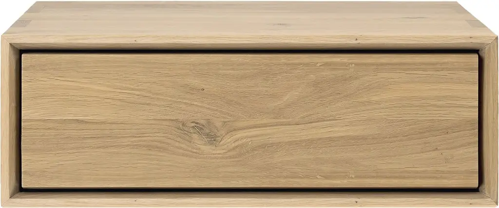 The oak's distinctive grain, which has been enhanced by a hard-wax oil finish, is the only adornment this wall-mounted drawer needs. It makes a beautifully minimalist nightstand on its own; several on a wall can serve as shelves with hidden storage.