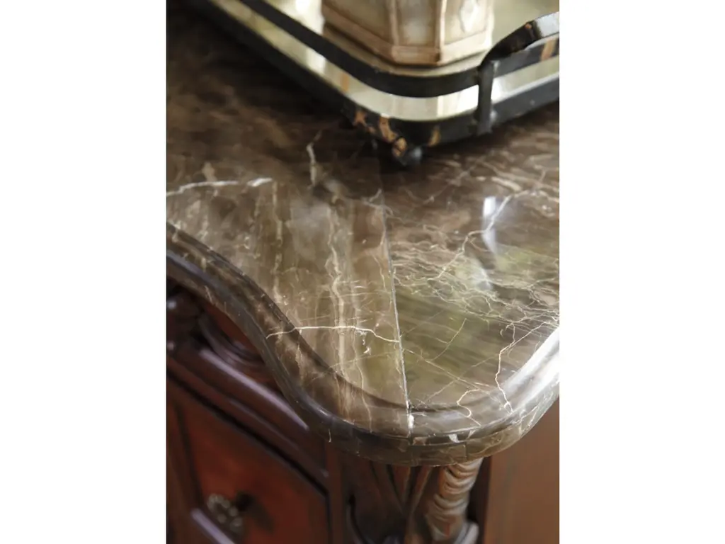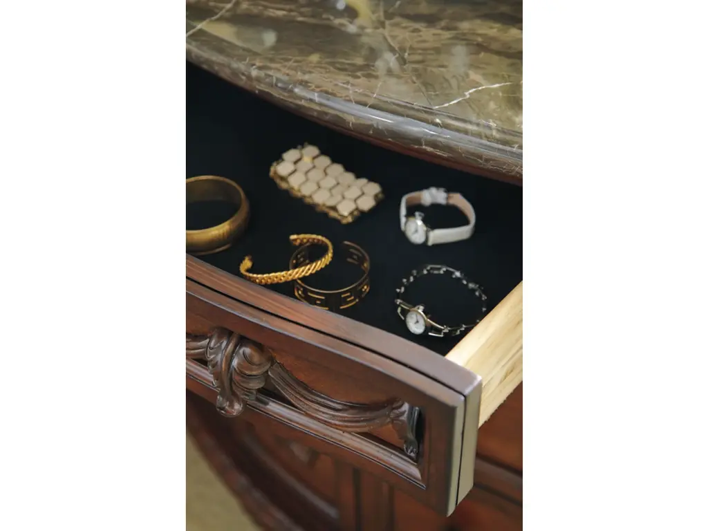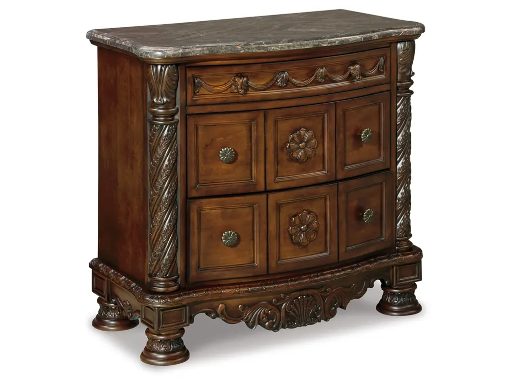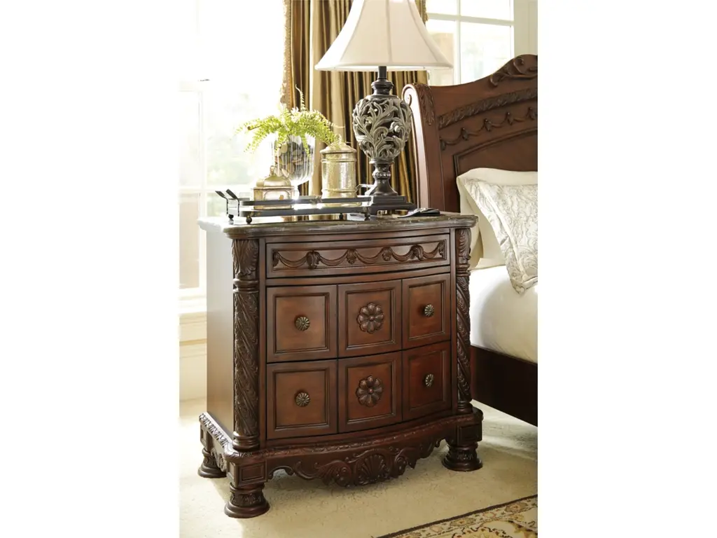 Inspired by the grandeur and grace of Old World style, the North Shore nightstand is nothing short of stunning. A choice blend of materials is accented by detailed ornamental appliques. The diamond-patterned marble veneer tops off the opulence. Three smooth-gliding drawers serve your bedside storage needs exceptionally well.