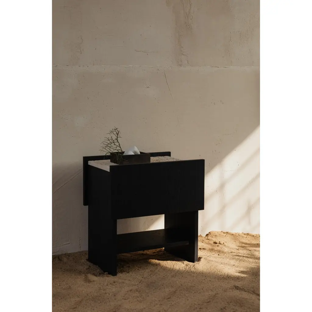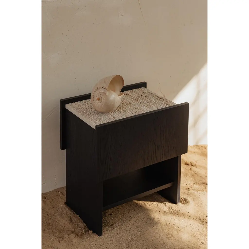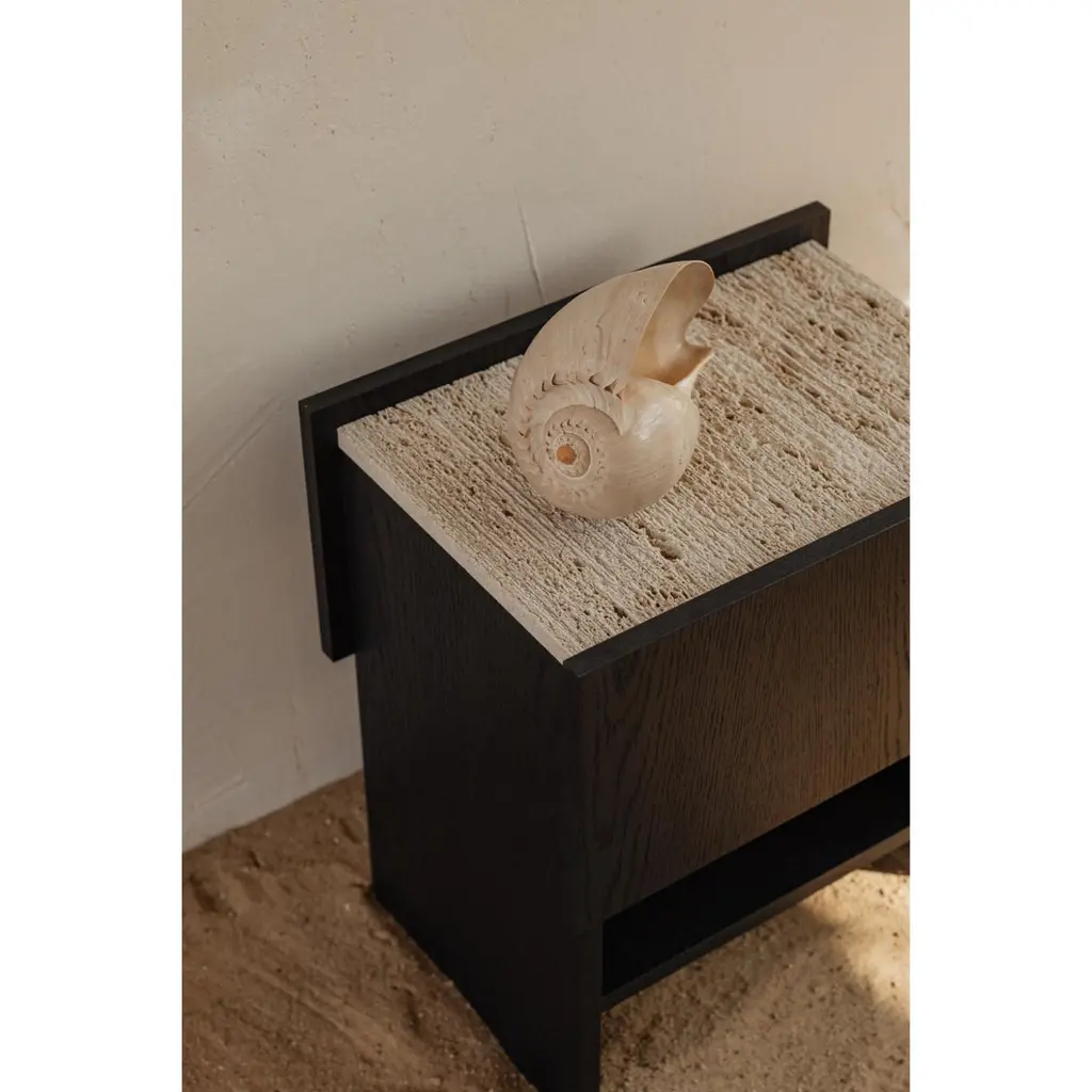 Noto Bedside Table by Un’commonDesigned by Małgorzata Korycka.Dimensions: D 36,5 x W 50 x H 54 cm.Materials: Graphite oak and travertine.Available in different finishes and materials. Please contact us.The Noto nightstand from the LINEE series is an elegant and functional piece of bedroom furniture. A handy drawer and an additional shelf provide storage space. As with the Oria console, the heart of the furniture is a beautiful top made of natural stone: unique striated travertine or elegant Taj Mahal quartzite with a gorgeous satin finish.The LINEE series [ from Italian lines ] was inspired by the magnificent Italian travertine, which has been given a unique striated texture – a material that delights at first sight.The body is made of ecological furniture board covered with natural oak veneer in 3 shades of staining: natural, cognac, and graphite. It is characterized by durability and beautiful, even grain, which perfectly harmonizes with the texture of marble. The shelves and drawers have a TIP-ON opening system so you can easily access items stored insideThe furniture tops were made of natural raw travertine, with a delicate beige coloration. A characteristic feature of this material is its porous finish. Despite its openwork structure, the stone is extremely durable and resistant to mechanical damage.We are a Polish workshop that designs and hand-makes furniture from marble and steel. Our furniture should not only be well-designed – it should be a feast for the senses. Nothing can produce this effect quite as good as marble.It is a beautiful, refined, natural material used for centuries in architecture, art, and everyday life. There are many different stone quarries, offering different types and colors of marble. However, because it is a natural material formed in a very complex process, it is virtually impossible to extract two identical pieces of stone. In our opinion, in a world ruled by plastic and mass production, this thrill of surprise is a bit of genuine luxury, reserved only for natural materials and their enthusiasts.Thanks to the physical properties of stone and precise workmanship, Un’common furniture is built to last. Over time, a natural patina may form on the surface, adding extra charm to your beautiful and refined furniture, which – if treated well – will reward you every day. Nothing can beat the taste of coffee when you drink it at a marble table.