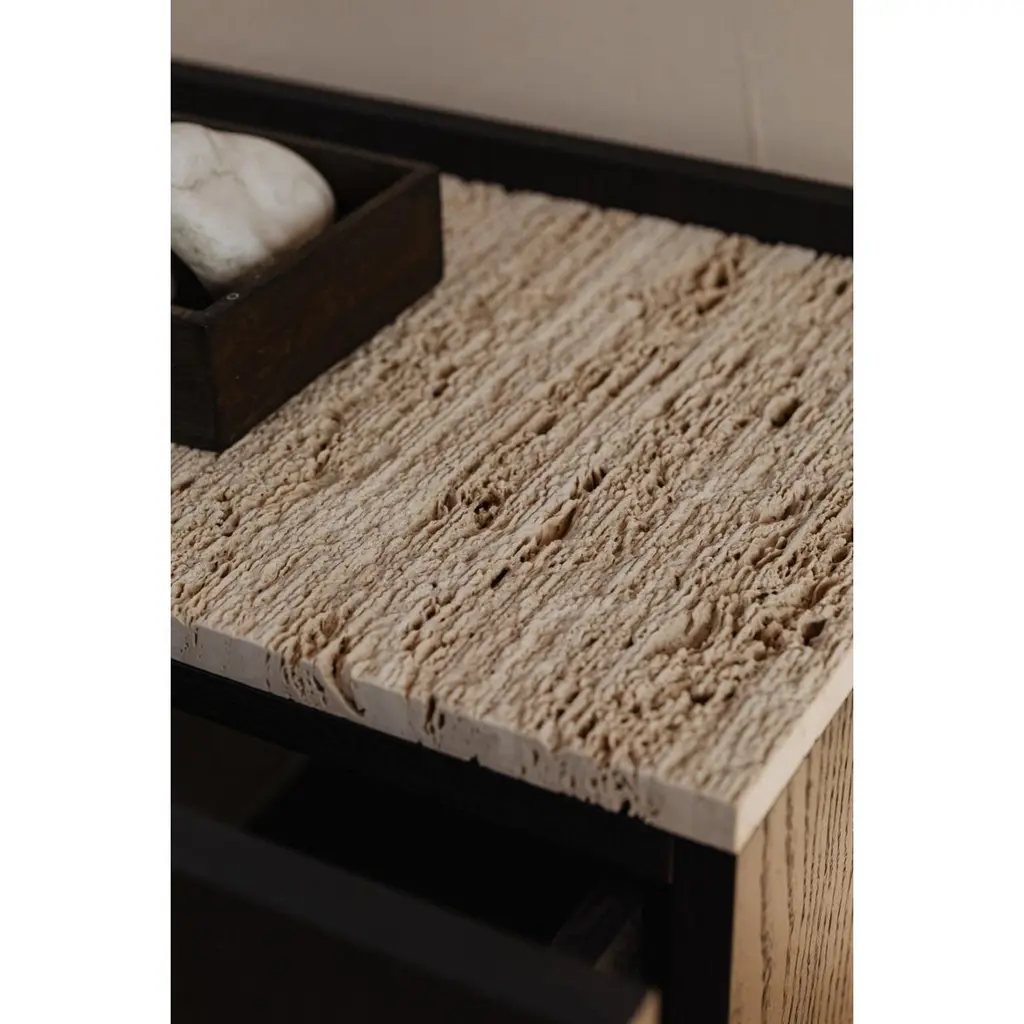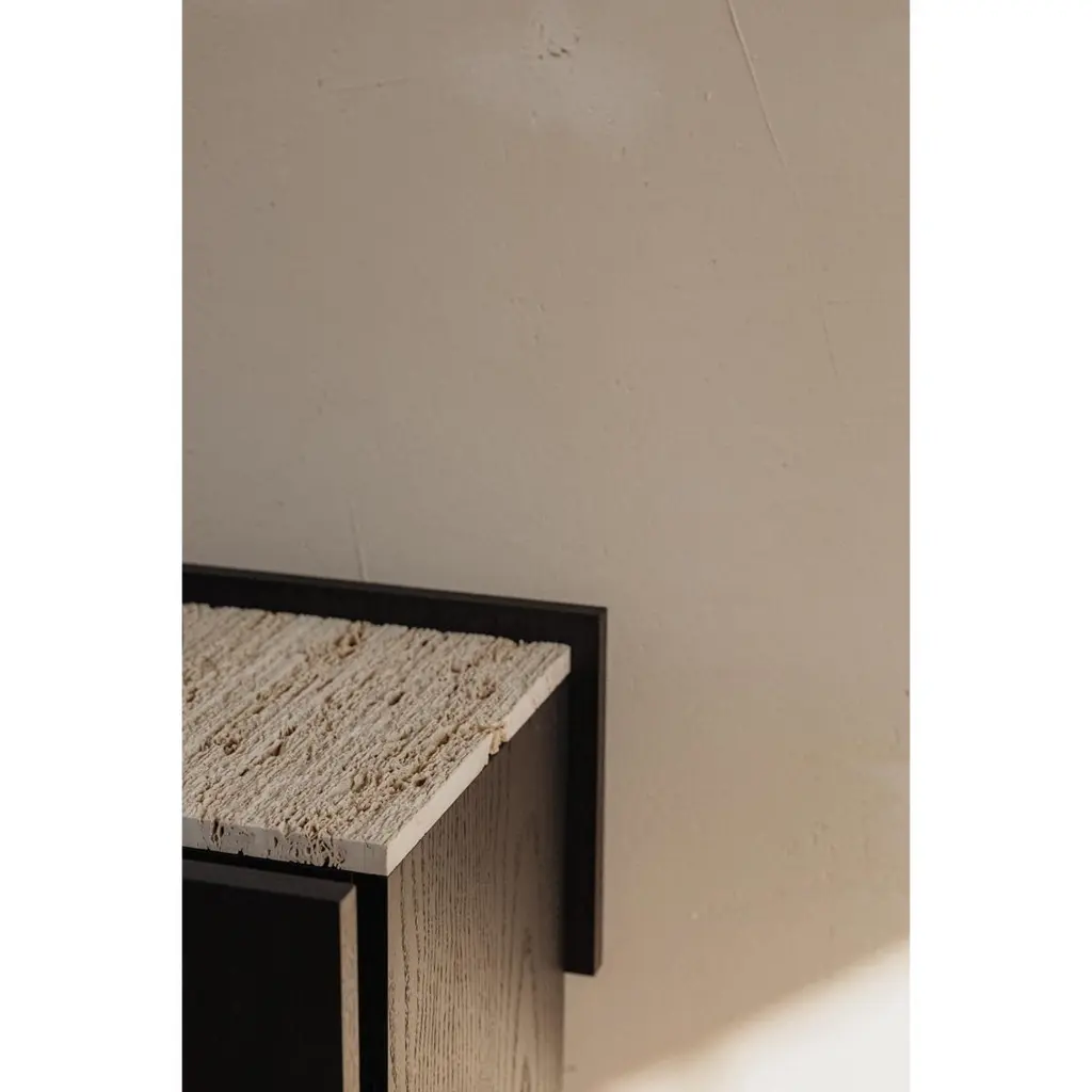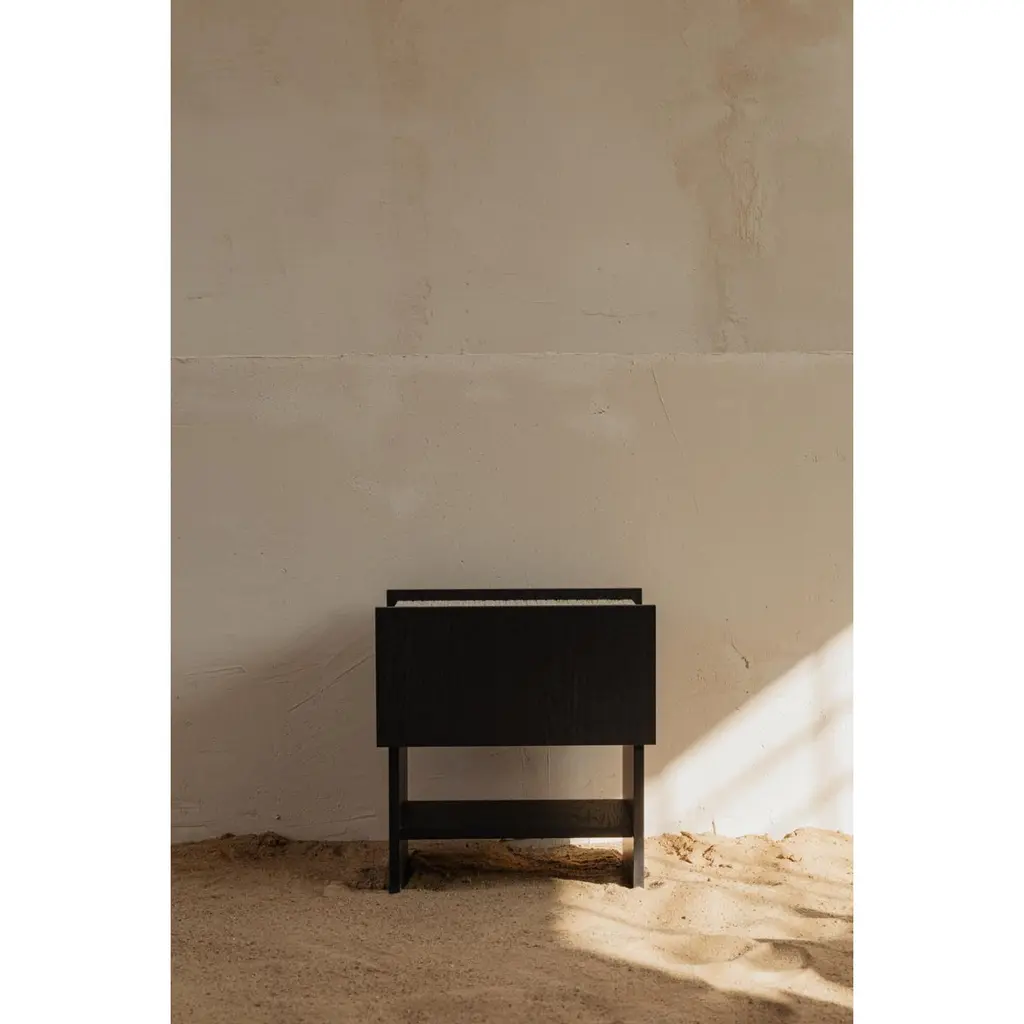 Noto Bedside Table by Un’commonDesigned by Małgorzata Korycka.Dimensions: D 36,5 x W 50 x H 54 cm.Materials: Graphite oak and travertine.Available in different finishes and materials. Please contact us.The Noto nightstand from the LINEE series is an elegant and functional piece of bedroom furniture. A handy drawer and an additional shelf provide storage space. As with the Oria console, the heart of the furniture is a beautiful top made of natural stone: unique striated travertine or elegant Taj Mahal quartzite with a gorgeous satin finish.The LINEE series [ from Italian lines ] was inspired by the magnificent Italian travertine, which has been given a unique striated texture – a material that delights at first sight.The body is made of ecological furniture board covered with natural oak veneer in 3 shades of staining: natural, cognac, and graphite. It is characterized by durability and beautiful, even grain, which perfectly harmonizes with the texture of marble. The shelves and drawers have a TIP-ON opening system so you can easily access items stored insideThe furniture tops were made of natural raw travertine, with a delicate beige coloration. A characteristic feature of this material is its porous finish. Despite its openwork structure, the stone is extremely durable and resistant to mechanical damage.We are a Polish workshop that designs and hand-makes furniture from marble and steel. Our furniture should not only be well-designed – it should be a feast for the senses. Nothing can produce this effect quite as good as marble.It is a beautiful, refined, natural material used for centuries in architecture, art, and everyday life. There are many different stone quarries, offering different types and colors of marble. However, because it is a natural material formed in a very complex process, it is virtually impossible to extract two identical pieces of stone. In our opinion, in a world ruled by plastic and mass production, this thrill of surprise is a bit of genuine luxury, reserved only for natural materials and their enthusiasts.Thanks to the physical properties of stone and precise workmanship, Un’common furniture is built to last. Over time, a natural patina may form on the surface, adding extra charm to your beautiful and refined furniture, which – if treated well – will reward you every day. Nothing can beat the taste of coffee when you drink it at a marble table.