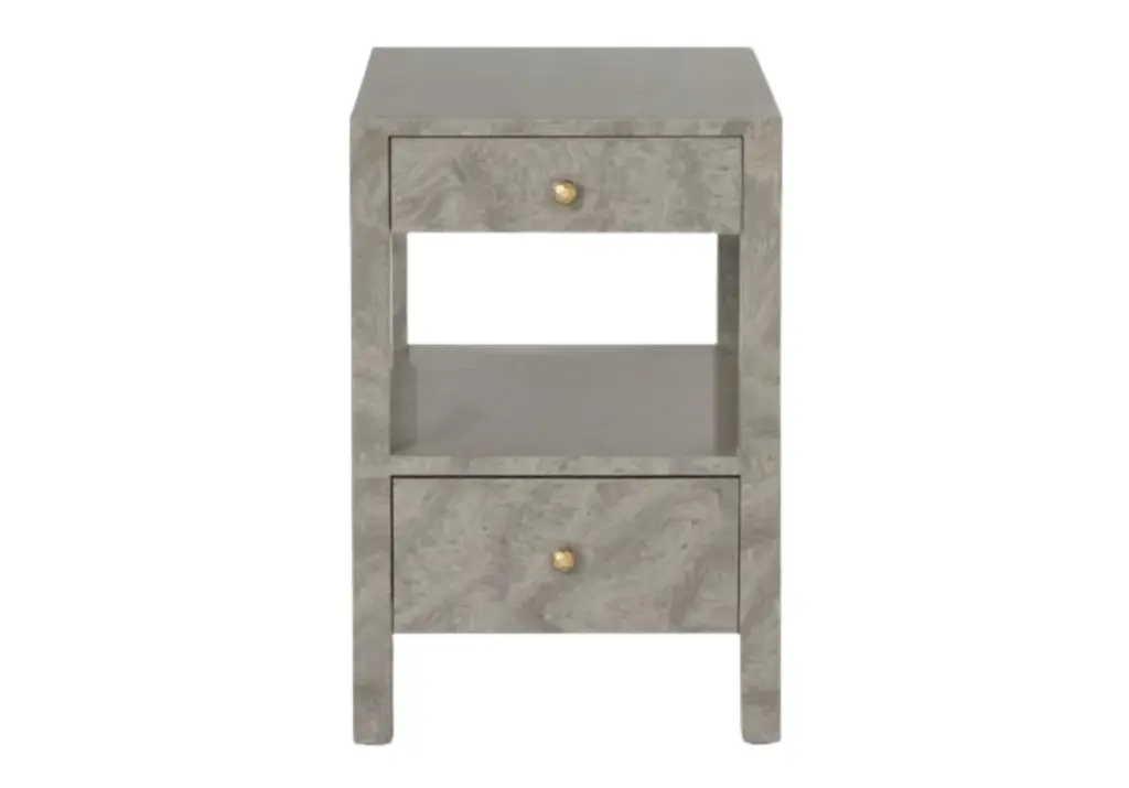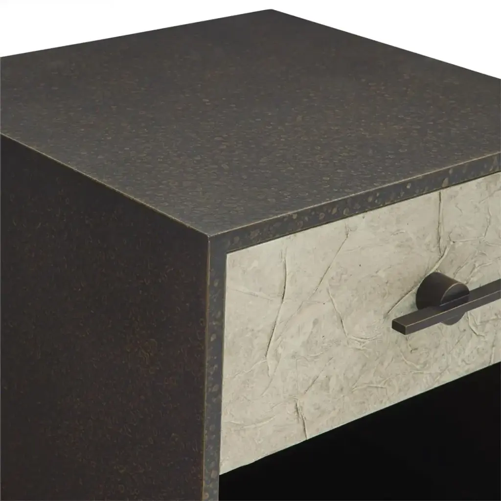 The Nouvelle Drawer is a stunning blend of refined tones and rich textures that greatly elevates an interior space. A wooden frame sitting atop two slender legs is adorned in a bronzed finish, playfully contrasted by ivory-hued rice paper stretched across the facade. Two drawers separated by open shelving feature long steel handles, matching the frame to complete the look.