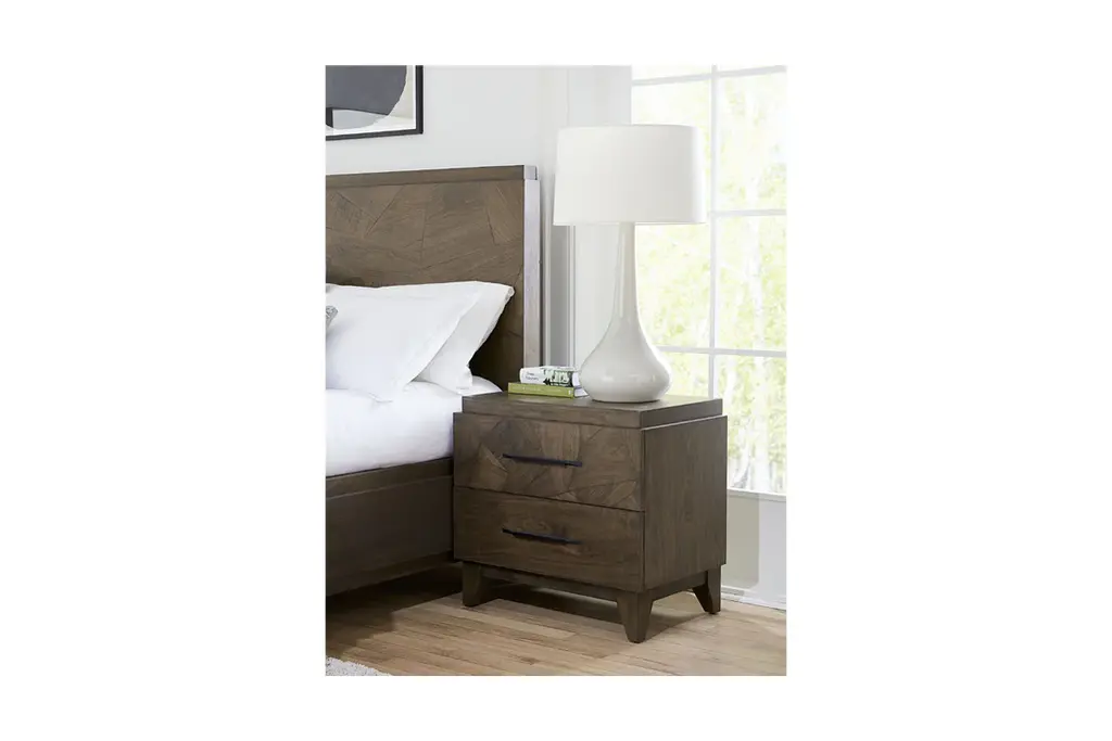 Crafted from gorgeous black walnut and sturdy mahogany wood, the Oakhill Nightstand is a stylish, practical addition to your bedroom. It features two spacious drawers to stow away your essential items, with wing-shaped pulls and ball-bearing glides for effortless access. A sleek matte lacquer top accents the rich brown finish with a standout geometric pattern on the top drawer, adding the perfect finishing touch to this unique, practical piece.