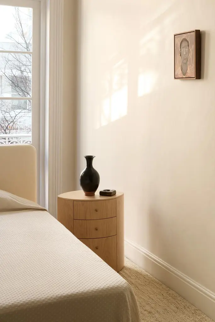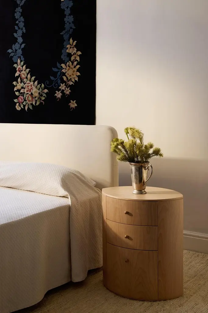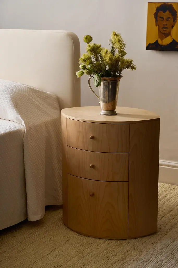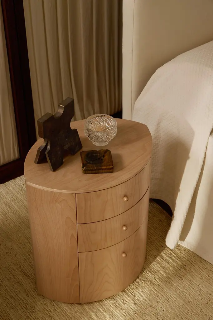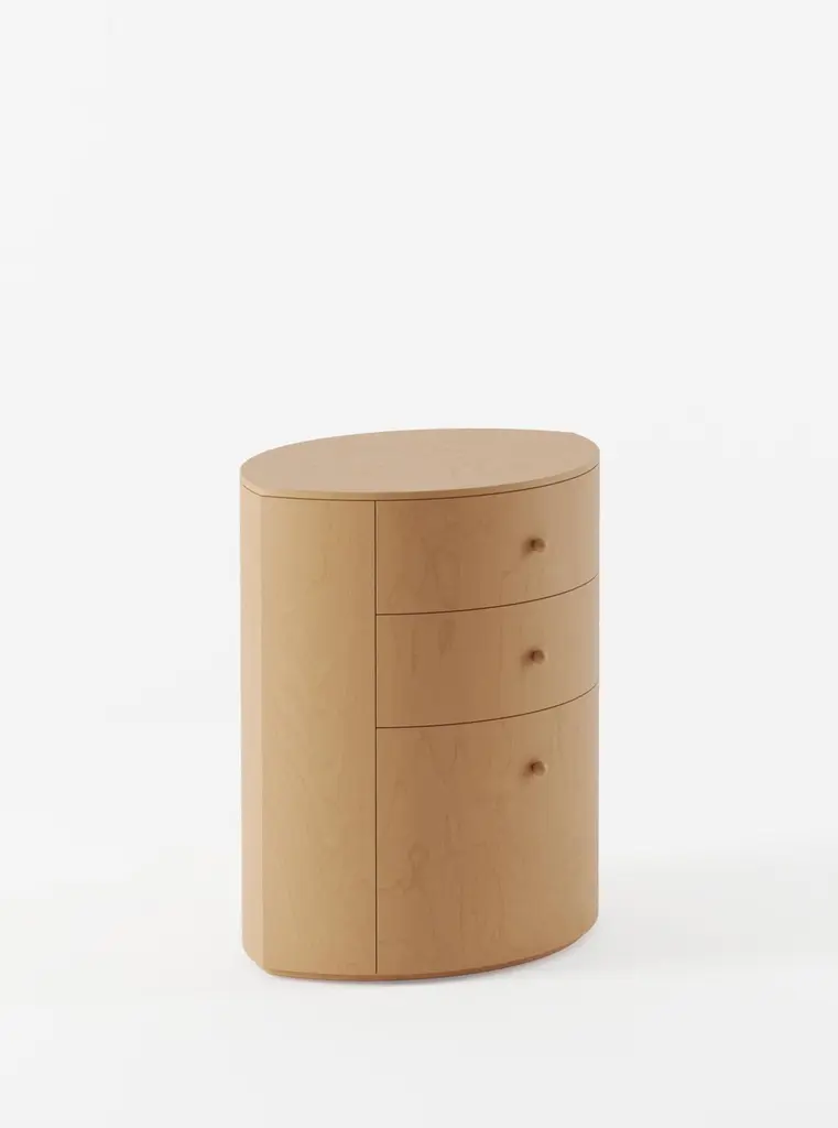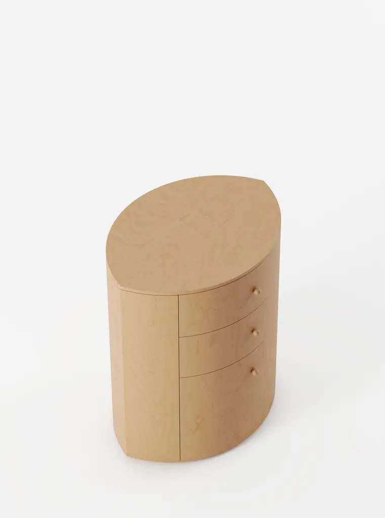 Product Inspiration The shape of the Observer nightstand is inspired by a fond childhood memory of designer Yaniv Chen. In his grandmother’s bedroom, her nightstand was a small but charming fixture—topped with night creams, a rotating pile of half‑read books, her gold cat‑eye reading glasses, and, most intriguing of all, a silver, eye‑shaped jewellery box. Quietly gleaming, the box seemed to hold a certain appeal, its presence felt without needing to shout for attention.For Chen, it was more than just a piece of furniture—it was part of her character: graceful, composed, and a little mysterious. This memory found its way into the design of the Observer nightstand, a piece that reflects the gentle theatre of life at the bedside. Its form is functional yet personal—rooted in memory, sentiment, and the subtle charm of simple elegance.Structure Handmade with Birch veneer showcasing a refined, even grain in its natural finish. Finished in a satin polyurethane lacquer for a smooth surface. The interior is fully lined with matching Birch veneer, and the three drawers are fitted with soft-close runners for a gentle, seamless glide. The veneer is expertly joined to maintain the natural flow of grain and color, preserving its understated beauty. Subtle variations in tone, grain pattern, and shading are part of the wood’s inherent character, ensuring each piece is one of a kind.Hardware Solid birch handleØ19 mm (0.7″) × 25 mm (1″)Soft close draw runners