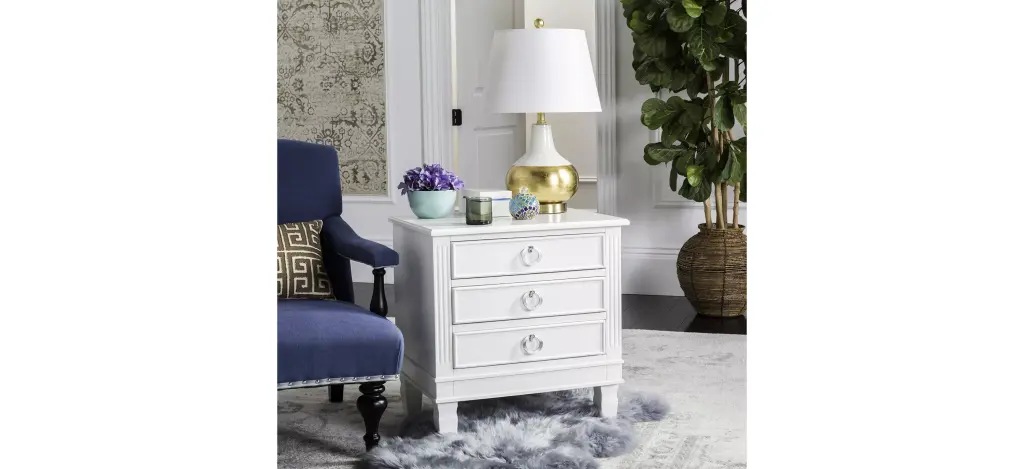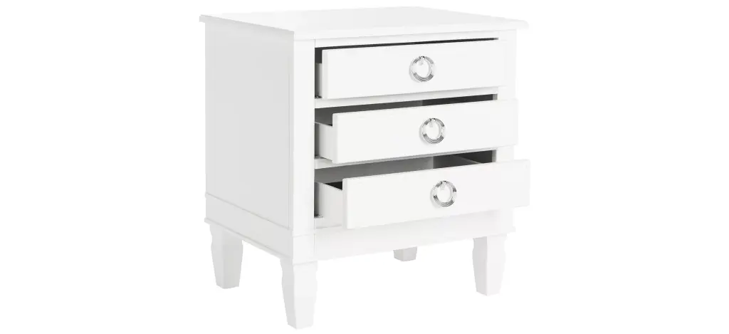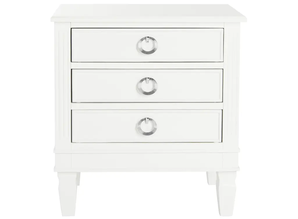 Bring the charm of the legendary Paris' brocantes to any space with this classic Odilia nightstand. Crafted with French style wood details and chic silver pulls on its ample three drawers, its quintessential white hue makes a graceful statement in any boudoir.