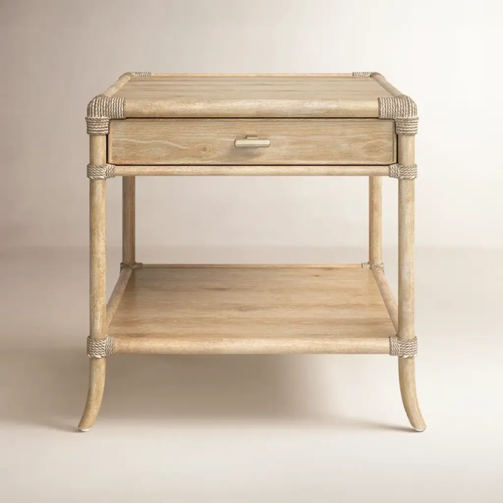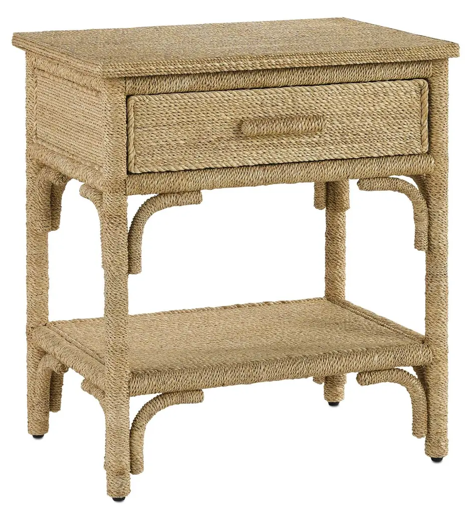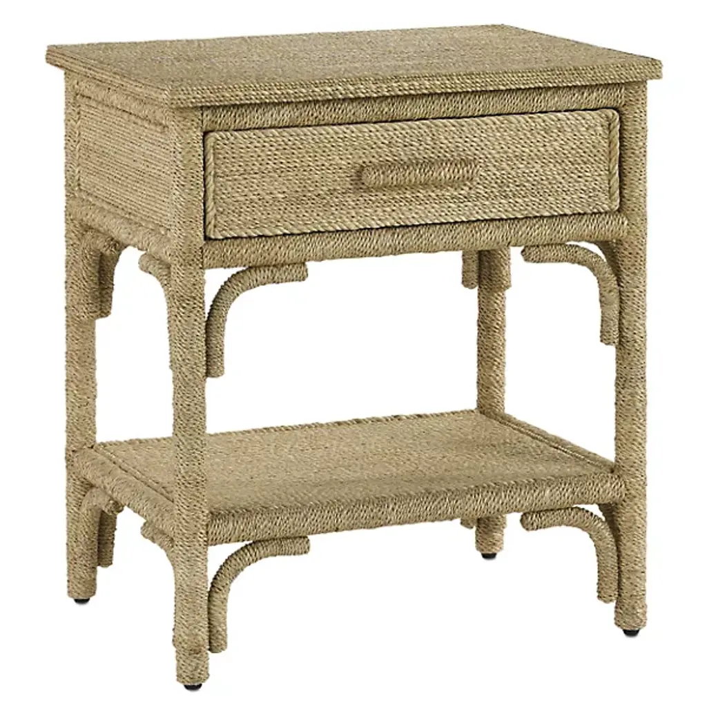 With the earthy feel of rattan and wicker but a much heavier dose of personality, the Olisa Nightstand is a wrap star! Given every viewable inch of this bedside beauty is covered in braided Abaca rope, it will make a noteworthy statement in an oceanfront retreat or in a lovely lakeside residence. We offer a number of pieces in this family of products that will look swimmingly anywhere water is a focal point beyond the windows. Finish: Natural/Washed Wood Materials: Abaca Rope/Solid Wood/Engineered Wood/Rattan Overall: 26.75"h x 24"w x 18"d Weight: 36 lb Hardware: Rope-Wrapped Drawer Pulls Drawers: 1 Slides: Ball Bearing Fixed Shelves: 1 Manufacturer: Currey and Company Free shipping in the U.S. With the earthy feel of rattan and wicker but a much heavier dose of personality, the Olisa Nightstand is a wrap star! Given every viewable inch of this bedside beauty is covered in braided Abaca rope, it will make a noteworthy statement in an oceanfront retreat or in a lovely lakeside residence. We offer a number of pieces in this family of products that will look swimmingly anywhere water is a focal point beyond the windows. Finish: Natural/Washed Wood Materials: Abaca Rope/Solid Wood/Engineered Wood/Rattan Overall: 26.75"h x 24"w x 18"d Weight: 36 lb Hardware: Rope-Wrapped Drawer Pulls Drawers: 1 Slides: Ball Bearing Fixed Shelves: 1 Manufacturer: Currey and Company Free shipping in the U.S. With the earthy feel of rattan and wicker but a much heavier dose of personality, the Olisa Nightstand is a wrap star! Given every viewable inch of this bedside beauty is covered in braided Abaca rope, it will make a noteworthy statement in an oceanfront retreat or in a lovely lakeside residence. We offer a number of pieces in this family of products that will look swimmingly anywhere water is a focal point beyond the windows.