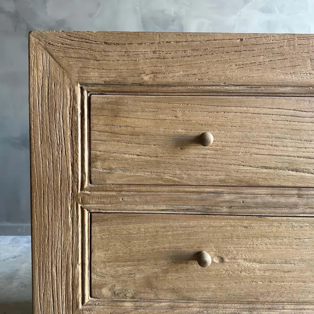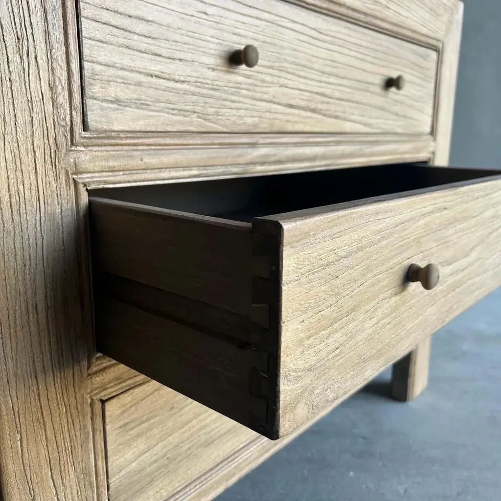 Ollie Nightstand in Natural Reclaimed Elm Wood Our nightstand is custom made from reclaimed elm wood in a natural finish. The eco-friendly dresser, is a great additional to any space. Experience the beauty of reclaimed wood while enjoying the convenience of abundant storage. Dovetail construction drawers, with wooden drawer guides, opens and closes with ease. This item is made from natural wood, each piece will have variations in the wood making each one unique 30”w x22”d x 26”h Finish: Natural / Wax Solid Elm Wood