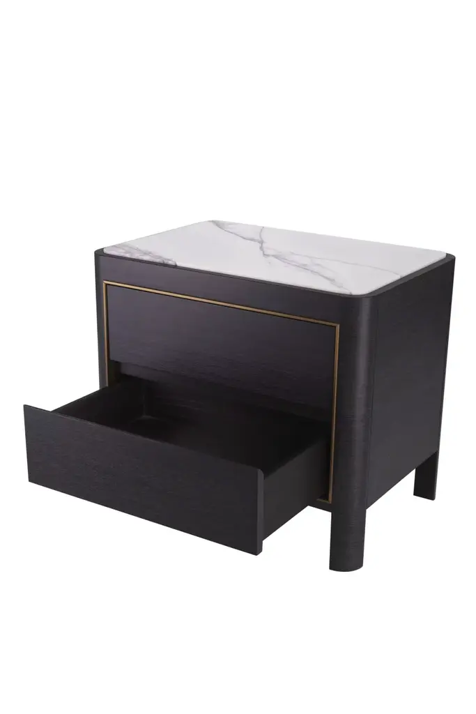Bedside Table Corazon is a chic and organised nightstand. Wrapped in a charcoal gray oak veneer casing and embellished with an Italian bianco lilac marble tabletop, this beautiful piece will enhance the style of your bedroom. The drawers are framed by a brushed brass rim and offer ample storage space for books, phone accessories and the like.