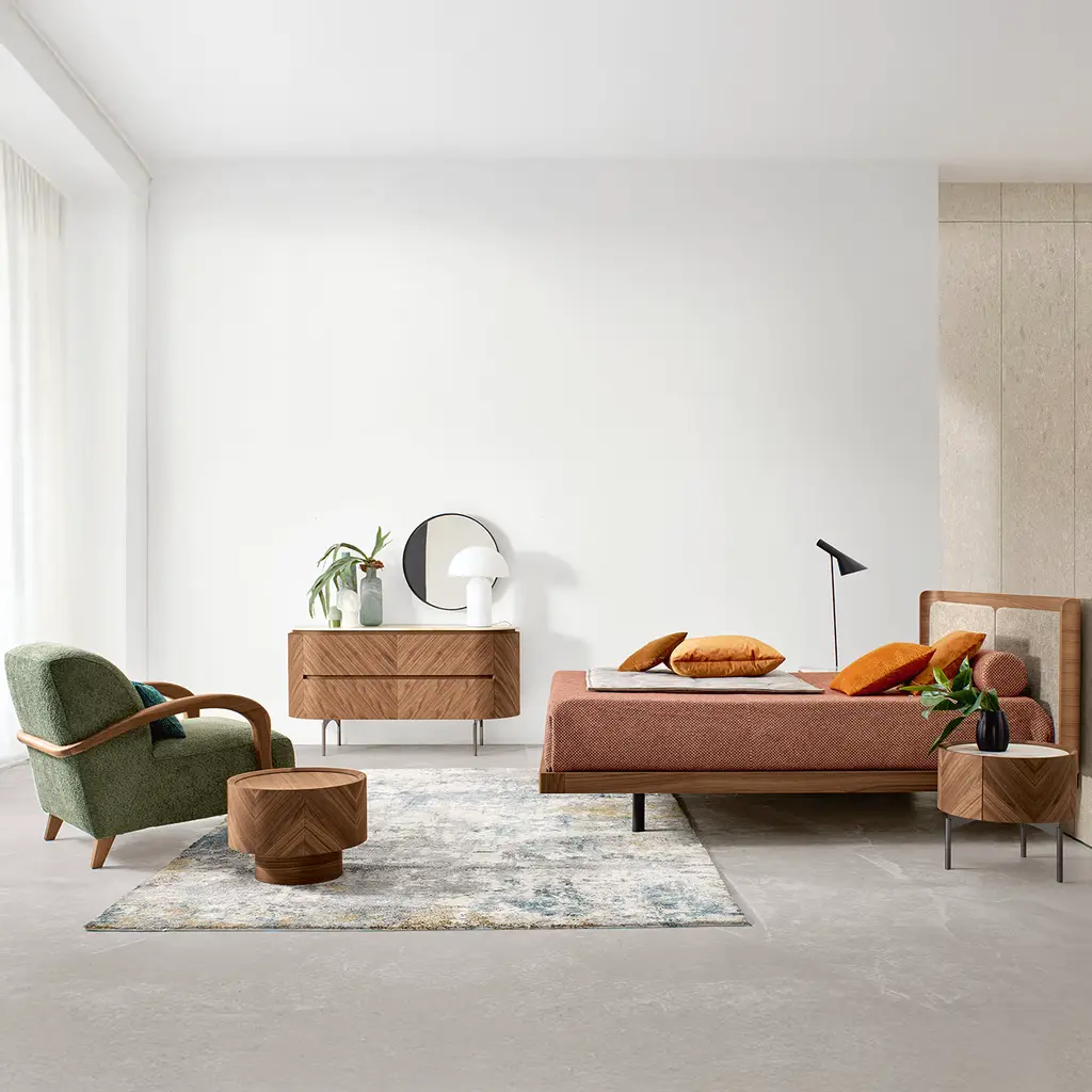 Versatile for diverse settings, this nightstand harmonizes warm Havana walnut with a bold Calacatta ceramic top. Its herringbone veneer enhances the rounded structure, blending geometric precision with organic textures. Supported by slender nickel legs, this piece stands out as a functional and artistic addition to bedrooms or lounges, perfect for elevating everyday spaces with understated elegance.