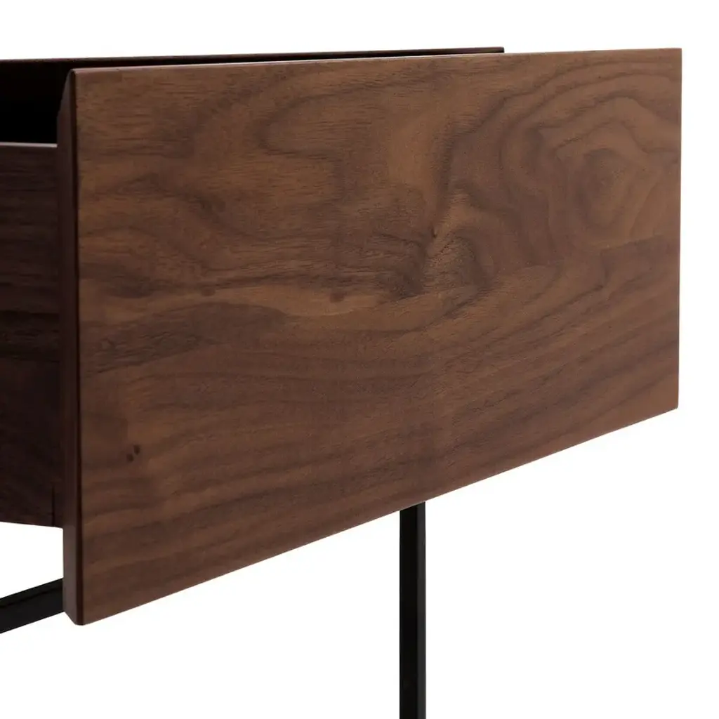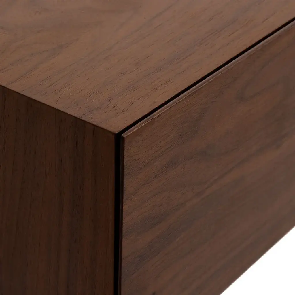 With its timelessly stylish drawer and airy base, the Oreko bedside table seduces with its sober and functional appearance.Chest and drawer made of walnut veneered MDF, polyurethane finish. FSC®-certified wood1 drawer with soft closing systemSteel base with satin nickel finish or metal base with used-effect epoxy finish