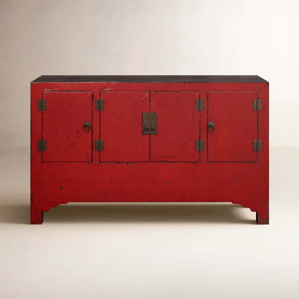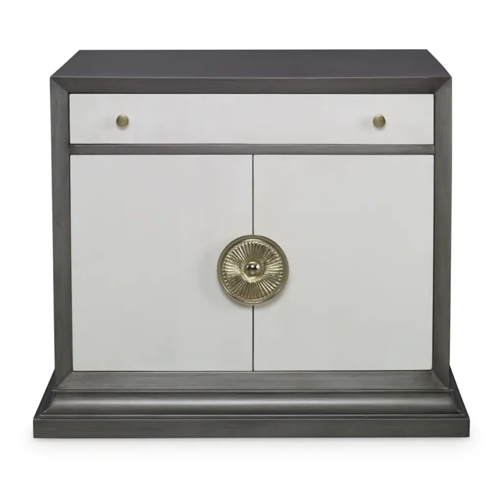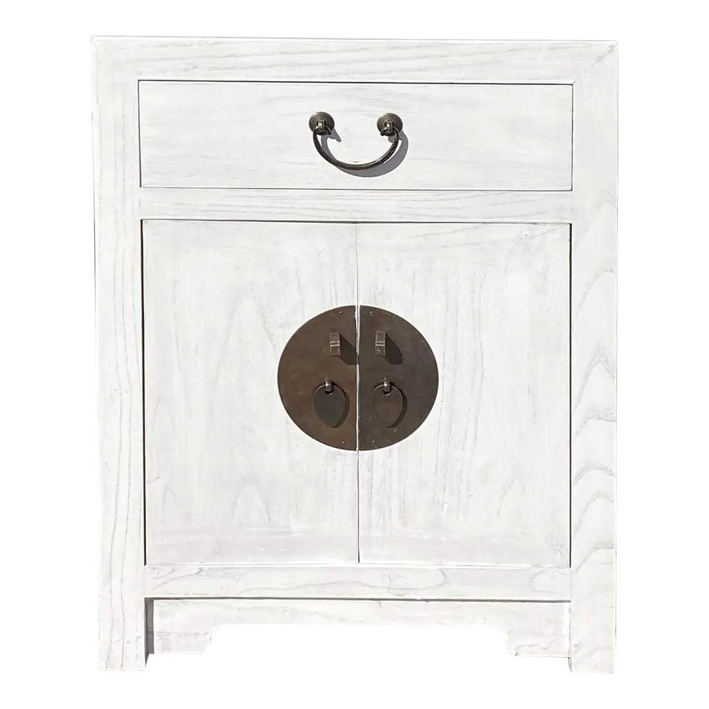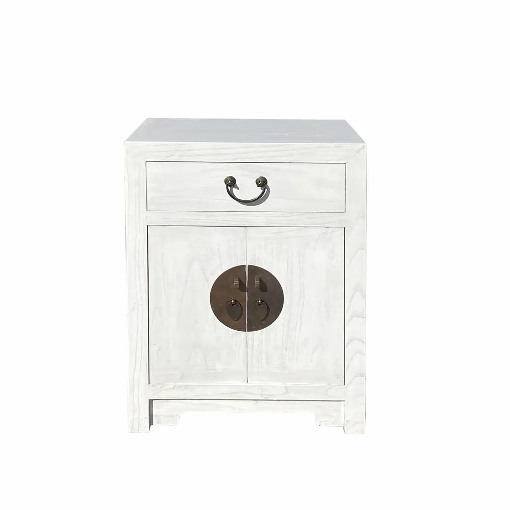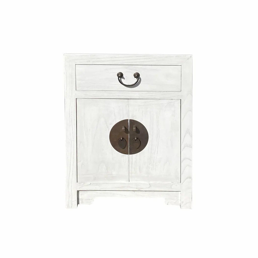 This is a handmade Chinese oriental end table nightstand with a drawer and two doors. The surface is finished with a distressed off white lacquer showing natural wood grain pattern Dimensions: w17.75" x d12"x h23.75" Origin: China Material: Elm Wood Condition: handmade, natural wood marks , variation on wood grain pattern Work: Ship in one piece, handmade quality
