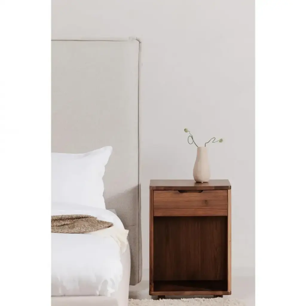 Easy, beautiful storage for the bedroom. Minimalism is captured naturally with the Osamu nightstand in solid walnut. Open for more, Osamu features an open display area for easy reach of your books, notes and treasures, while its single soft-close drawer will keep all nightly necessities on-hand. Poised with clean lines and contemporary style, this bedside table is neatness refined, coupling organic charm with top-quality execution.
