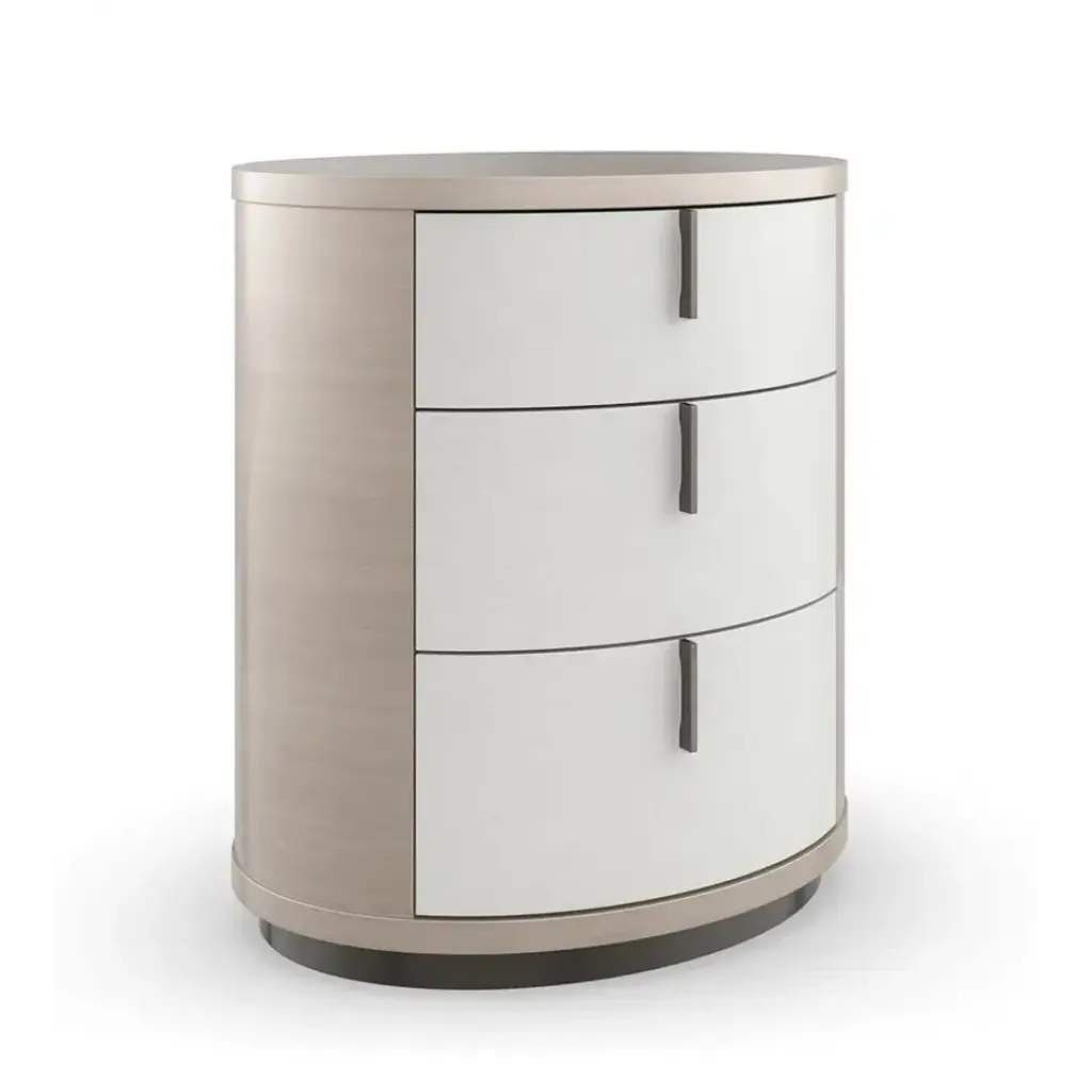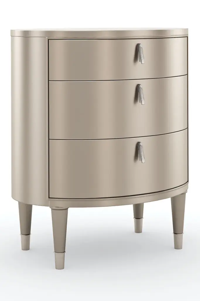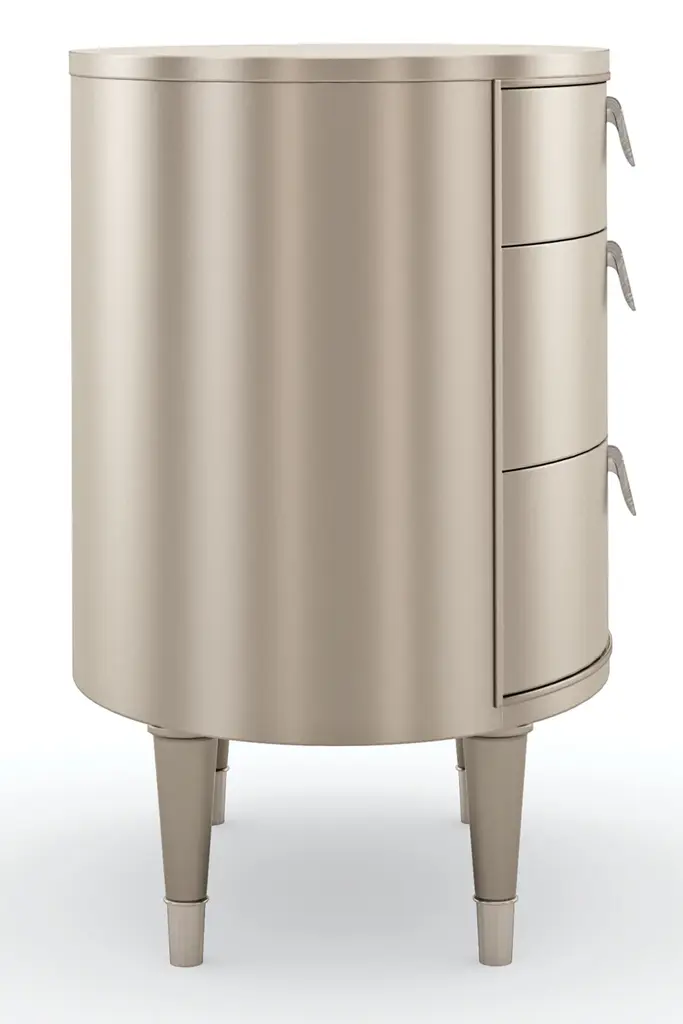 Indulge in elegance with our Oval Silver Nightstand from Caracole. This bedside beauty effortlessly adds glamour to any bedroom with its Soft Silver Paint finish and Polished Stainless Steel ferrules. The elongated Art Deco-inspired drawer pulls add a touch of sophistication, reminiscent of a luxurious pendant.