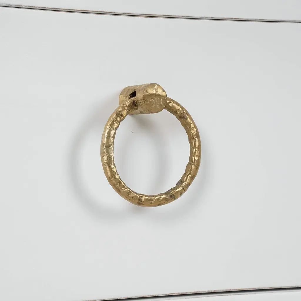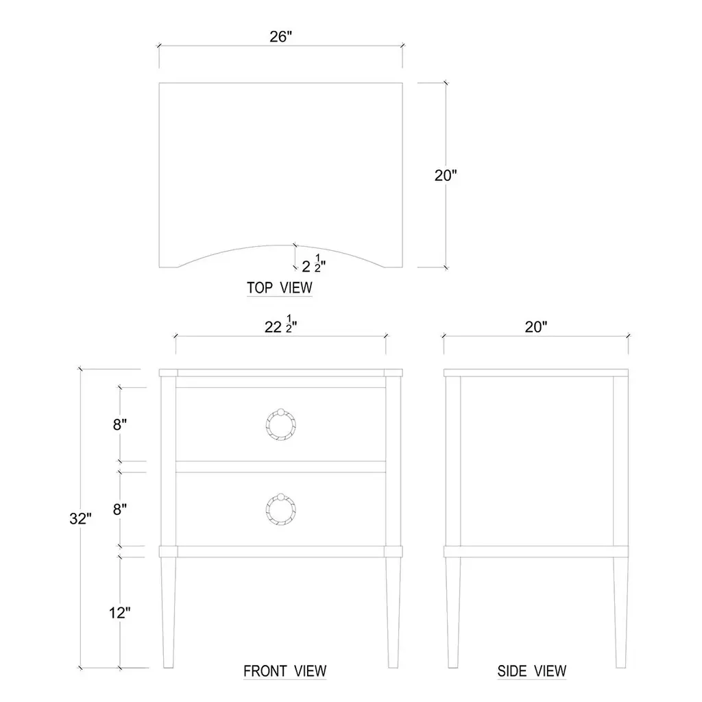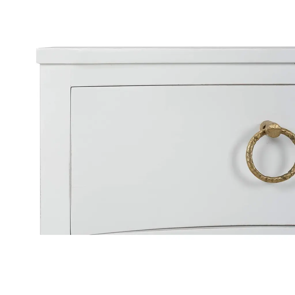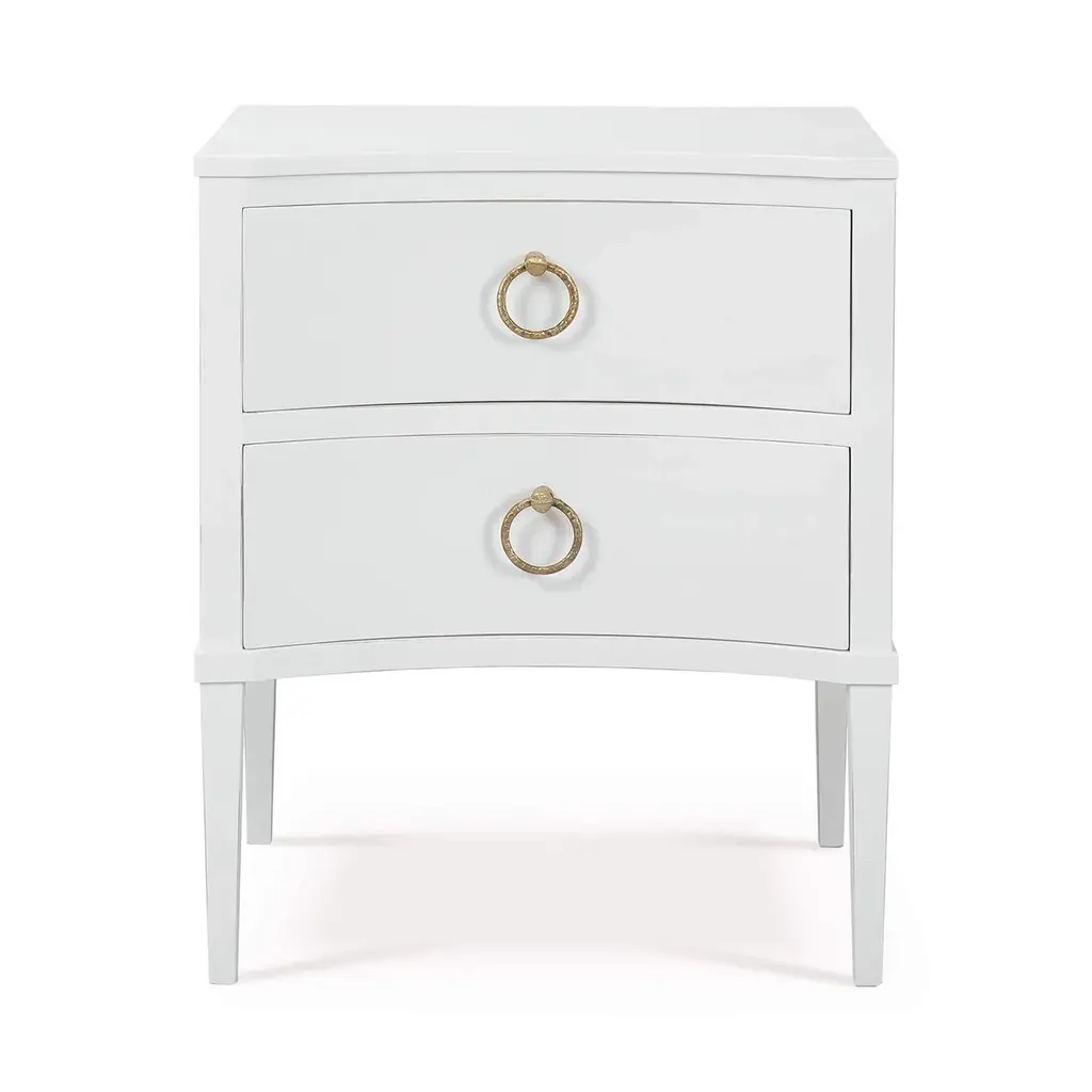 Made of mahogany and finished in a lightly distressed architectural white painted finish, this bedside table showcases the timeless beauty of classic design with a contemporary twist. The incurved front adds a distinctive touch, while the two drawers provide ample storage for your essentials. Each drawer is adorned with elegant ring pulls, adding a touch of refined charm to this exquisite piece. Dimensions: 26" W x 20" D x 32" H