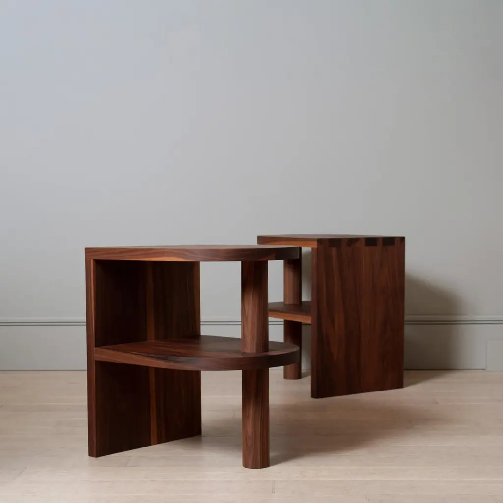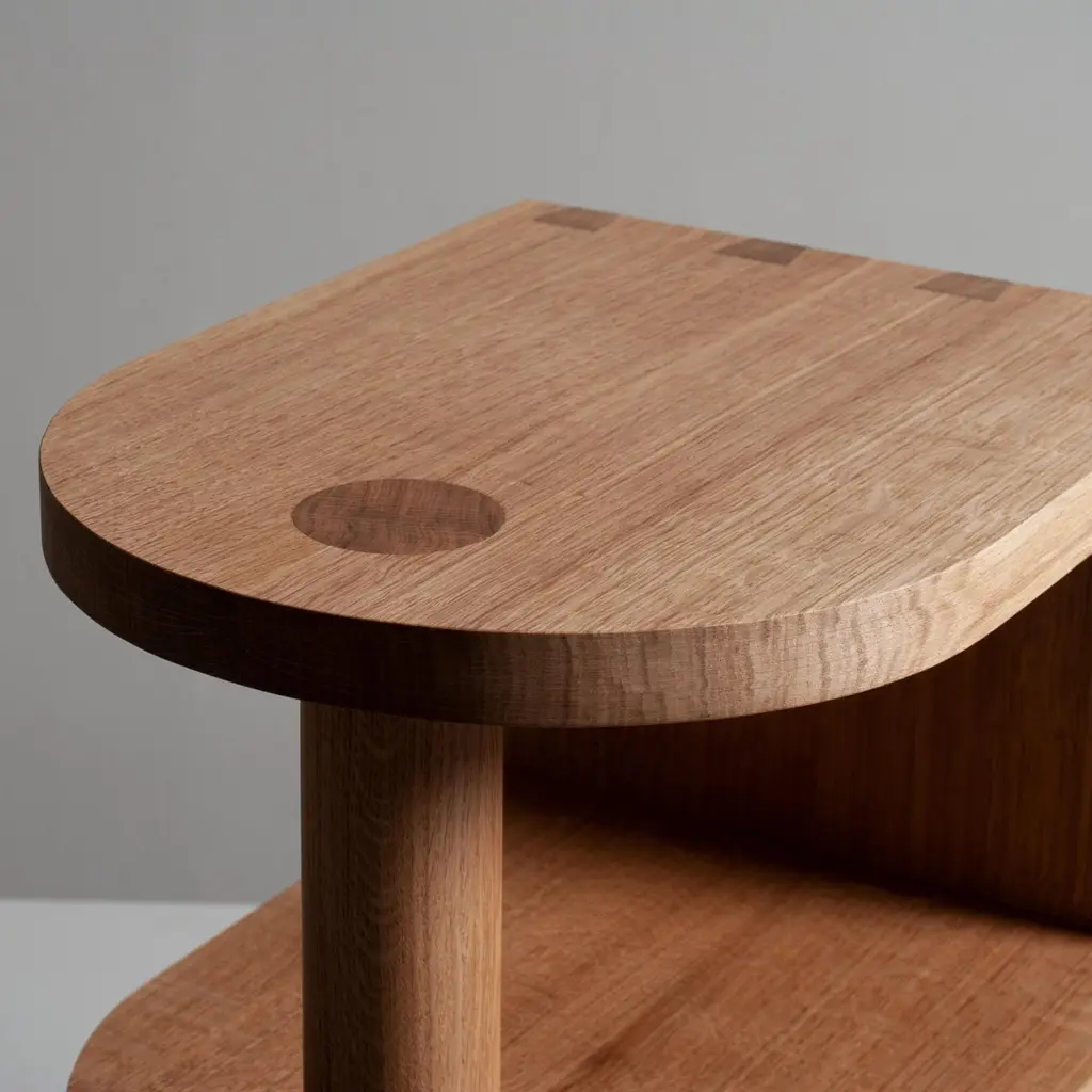 An adapted version of our architectural oak pillar nightstands / end tables. Designed and handcrafted in England using traditional cabinetry techniques with the most beautiful and finest English quartersawn oak. Hand-cut large dovetail jointing with turned oak upright column piercing through the sections cut flush/visible to the top surface.A design drawing influences from very early 20th century European modernist architecture. These are unique multi functioning pieces of furniture. The top surface has a hidden supporting collar within the surface and can take significant weight. These are substantial, bold and striking pieces of completely handmade furniture, built to last a lifetime and beyond. Finished in durable natural oils.We design bold and distinctive pieces of furniture – our main objective is combining the design alongside the natural beauty and properties of the raw materials.These timbers and materials are very carefully chosen for each specific design - maintaining our focus on the benefits, visual impact and strengths of what we use. Our regular use of English Quartersawn Oak is one case in point. It has been the beloved timber of fine furniture makers across the world for centuries. It is costly to produce but gives huge benefits and rewards such as its striking medullary rays and superb stability qualities.By utilising these wonderful and naturally occurring features with our contemporary designs we aim to continue creating some very distinct, tactile and idiosyncratic pieces.These are all completely handmade, in very small numbers, by our skilled craftspeople in England.