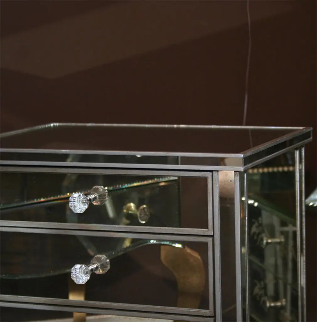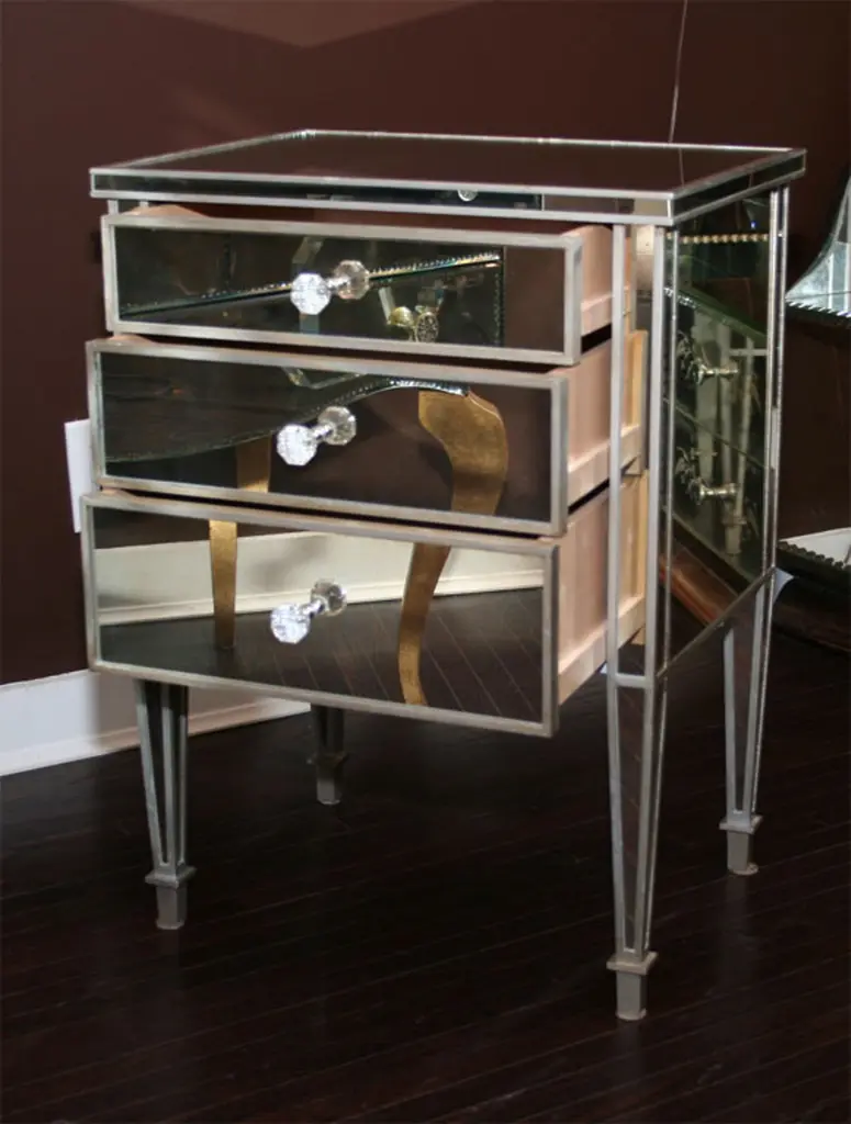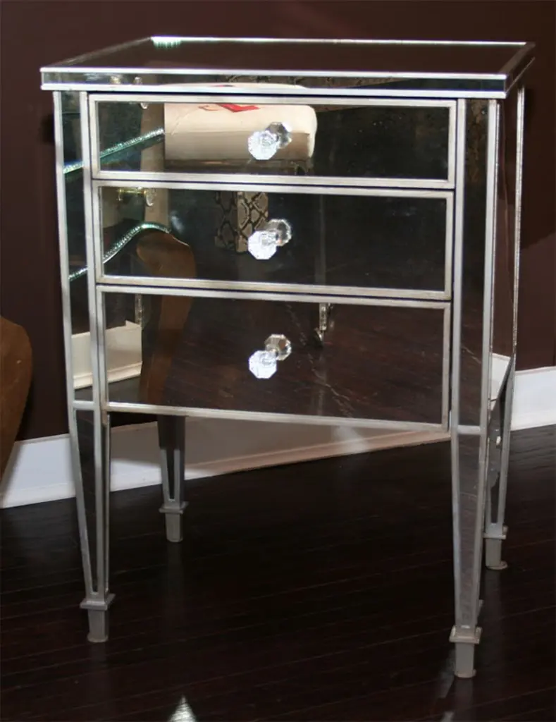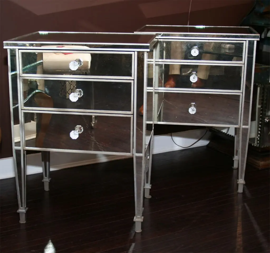 Pair Of 3-Drawer Silver Trim Mirrored Nightstands