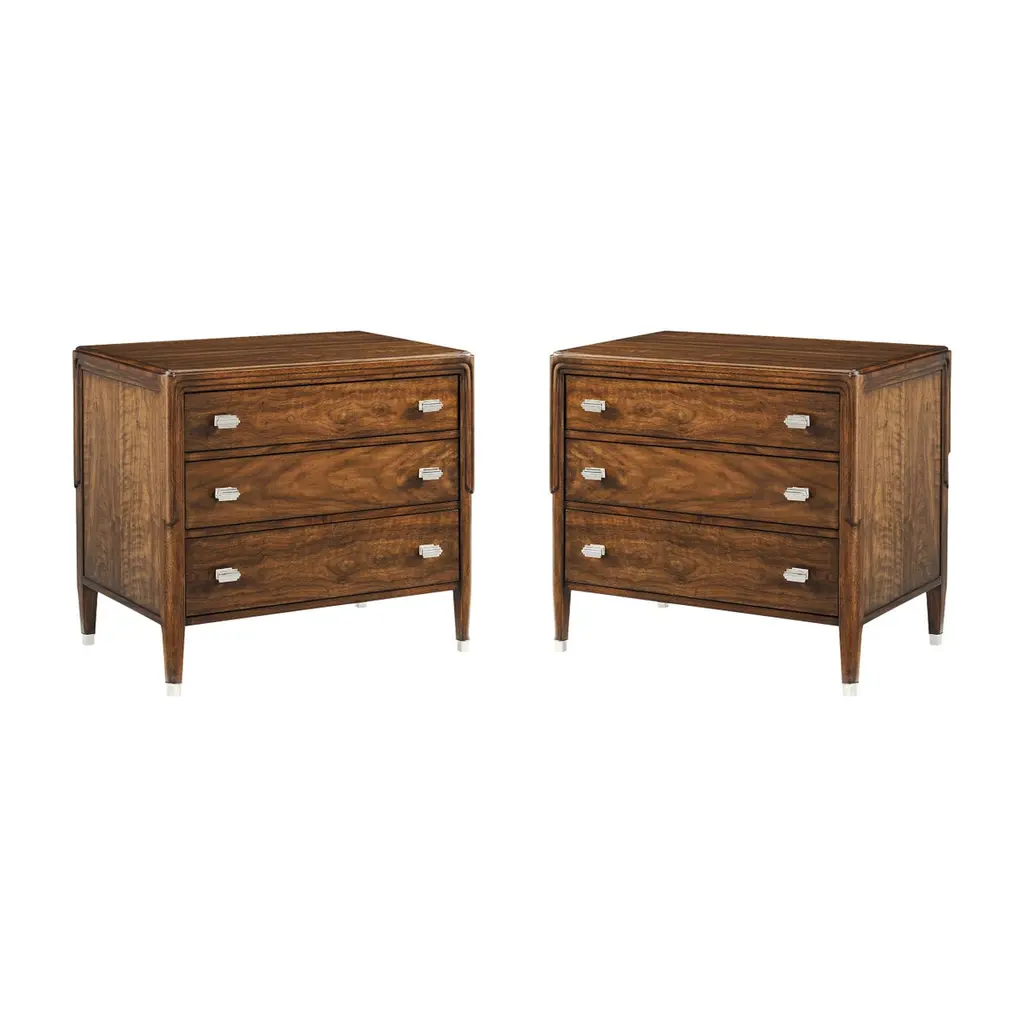 A true masterpiece of elegant design and meticulous craftsmanship. Shown in Pyramid Brown, this piece brings sophistication and functionality to your space. The rich Pyramid Brown finish of the luxurious Tamo ash veneer to the graceful curves embodies classic Art Deco style, enhancing any bedroom decor. Delicate hand-forged hardware to the three drawers in a Satin Brass finish creates a stunning contrast against the rich wood, adding a touch of elegance.Transform your bedroom into a haven of luxury with this stunning Art Deco nightstand, where timeless elegance meets modern functionality.Dimensions: 32" W x 20" D x 28" H