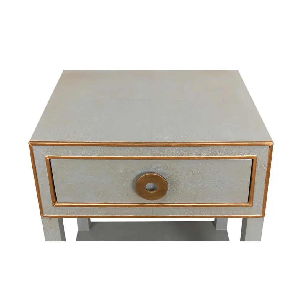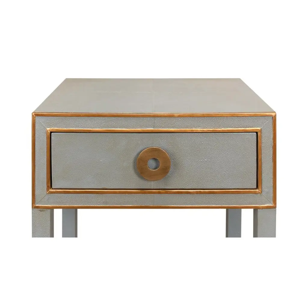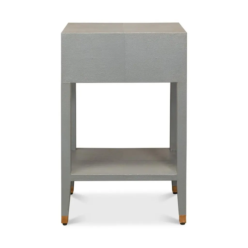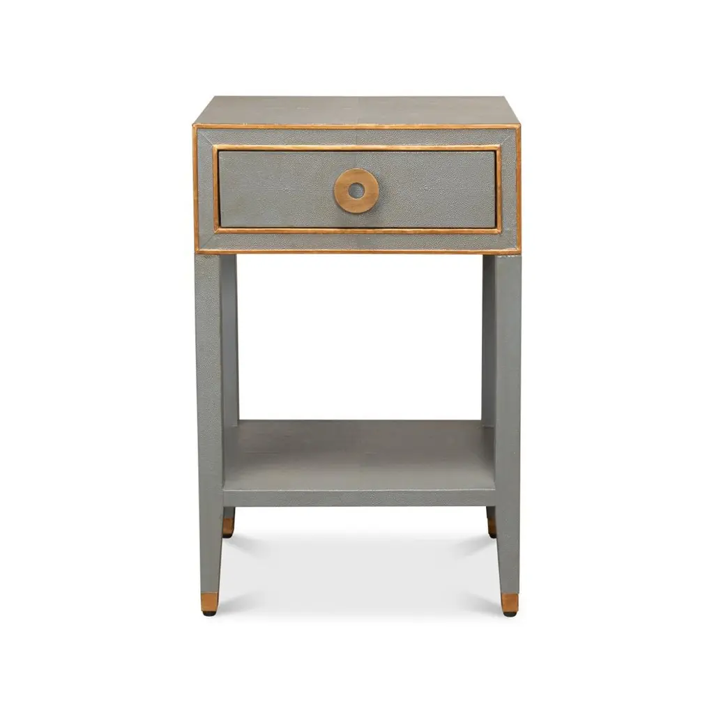 The grey nightstand pairs sophisticated shagreen-textured storm grey surfaces with gold accents for a statement of vintage luxury. The detailed facade showcases geometric brass trim and a circular pull that captures the refined elegance of 1920s design, while the textured grey finish adds depth and visual interest.This versatile table balances form and function with its smooth-gliding drawer and practical lower shelf for additional storage or display. Dimensions: 20" W x 14" D x 31" H
