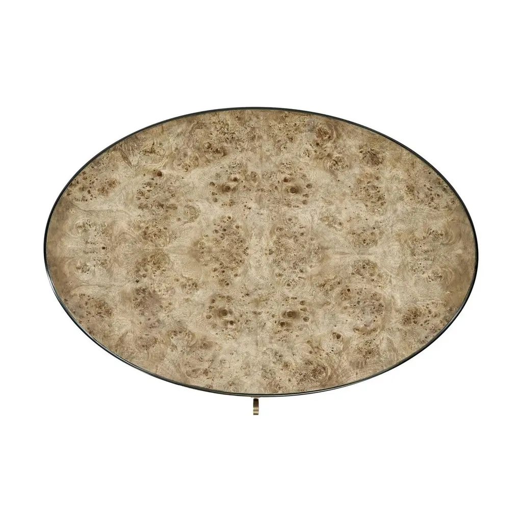 This exquisite Art Deco nightstand is the perfect addition to any bedroom that seeks a touch of glamour and sophistication. The oval shape, the ash burl veneer, and the ebonized trim make it a timeless piece that will elevate the decor of any room.Crafted from high-quality hardwood, this nightstand is built to last. The light, transparent lacquer finish adds a luxurious touch to the natural wood grain, while the hand-rubbed brass hardware complements the elegant look with a rich, natural patina.Dimensions: 30" W x 21" D x 28 1/8" H.