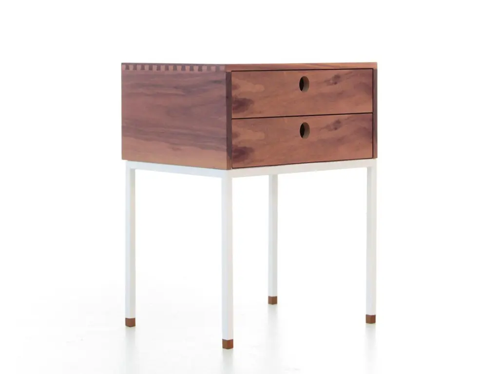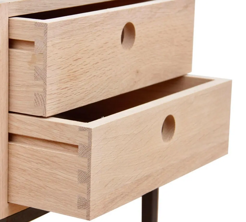 Cosmopol is an elegant and minimalist furniture line inspired by the values of Scandinavian functionalism.Entirely made in France, each piece is individually produced according to your dimensions:You can choose the depth and width of the cabinet, the wood species, and the color of the base.The cabinet and drawers are made of solid ash, oak or walnut, either oiled or covered with a water-resistant matte clear varnish. The interior of the drawers is made of solid ash wood. The joints are made with dovetail connections using environmentally friendly non-toxic glues. The varnishes are water-based and non-polluting, and the oil used is organic and vegetable-based. The base is made of satin-finished lacquered steel, available in black, white, or a range of twenty colors from the RAL palette (contact us). The legs can be finished with solid wood caps of the same species as the cabinet or with black plastic glides.We only use high-quality solid wood sourced from sustainably managed forests, without knots, cut from the most noble parts of the tree.