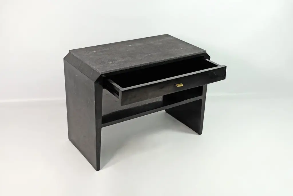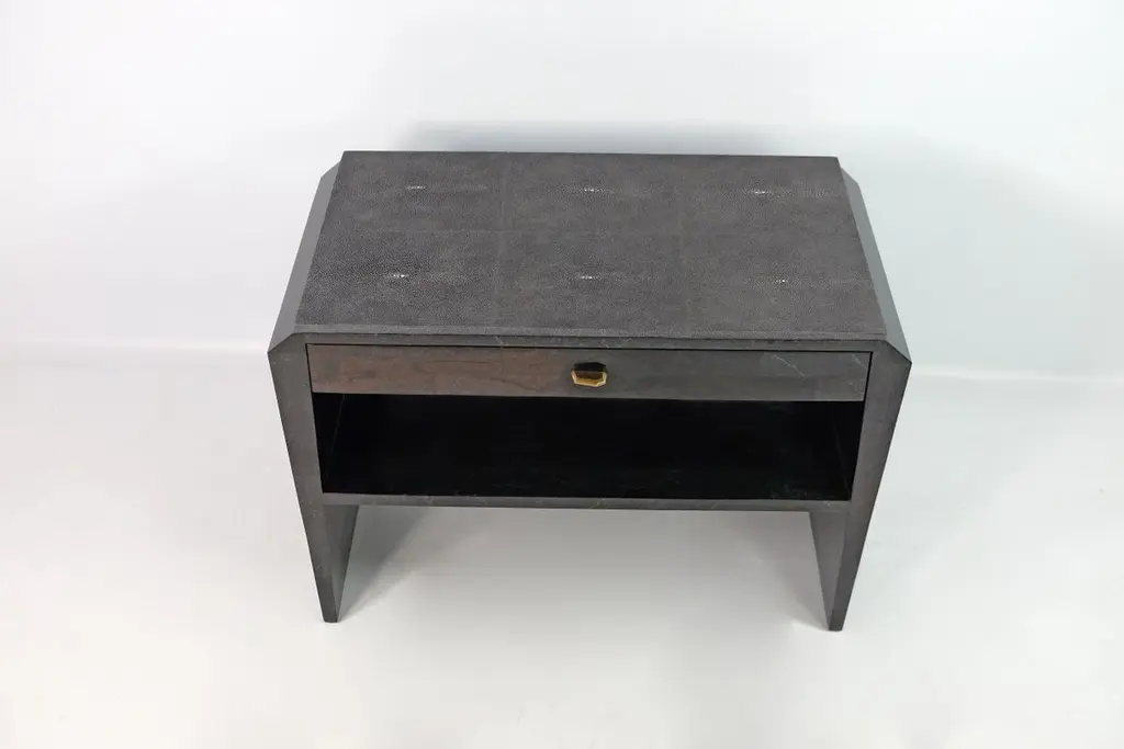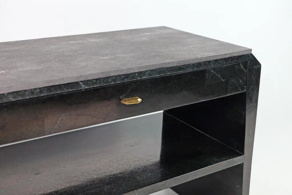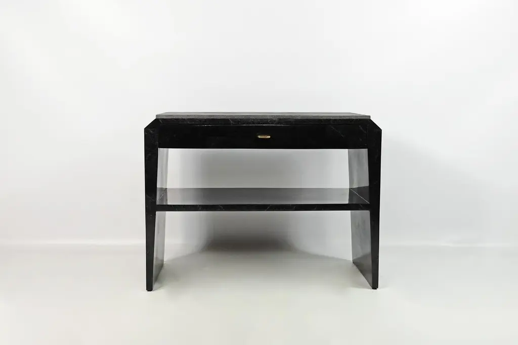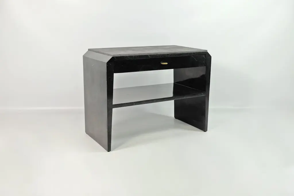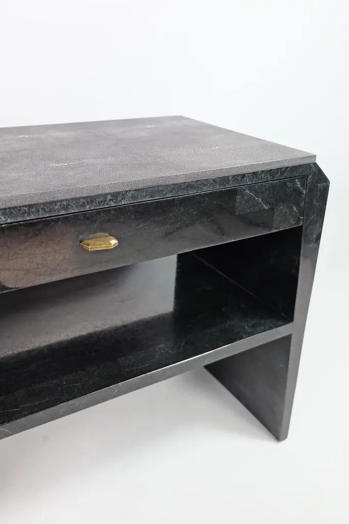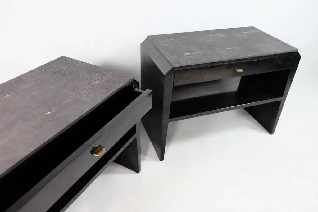 This pair of night stand tables is made of black stone (granit) marquetry with a top in shagreen. There is one drawer with a dark wood veneer interior, and a shelf in black stone.The knobs are in brass with an antic patina.The dimensions of this piece are W31,5" x D15,75" x H23,62" This piece piece can be made in any dimensions (price upon request).Care instructions:To clean, simply wipe with a dry clean clothDo not use any cleaning agent on the surfaceThis piece is 100% handmade by our talented team of master craftsmen.The price is for 1 set (2 tables).