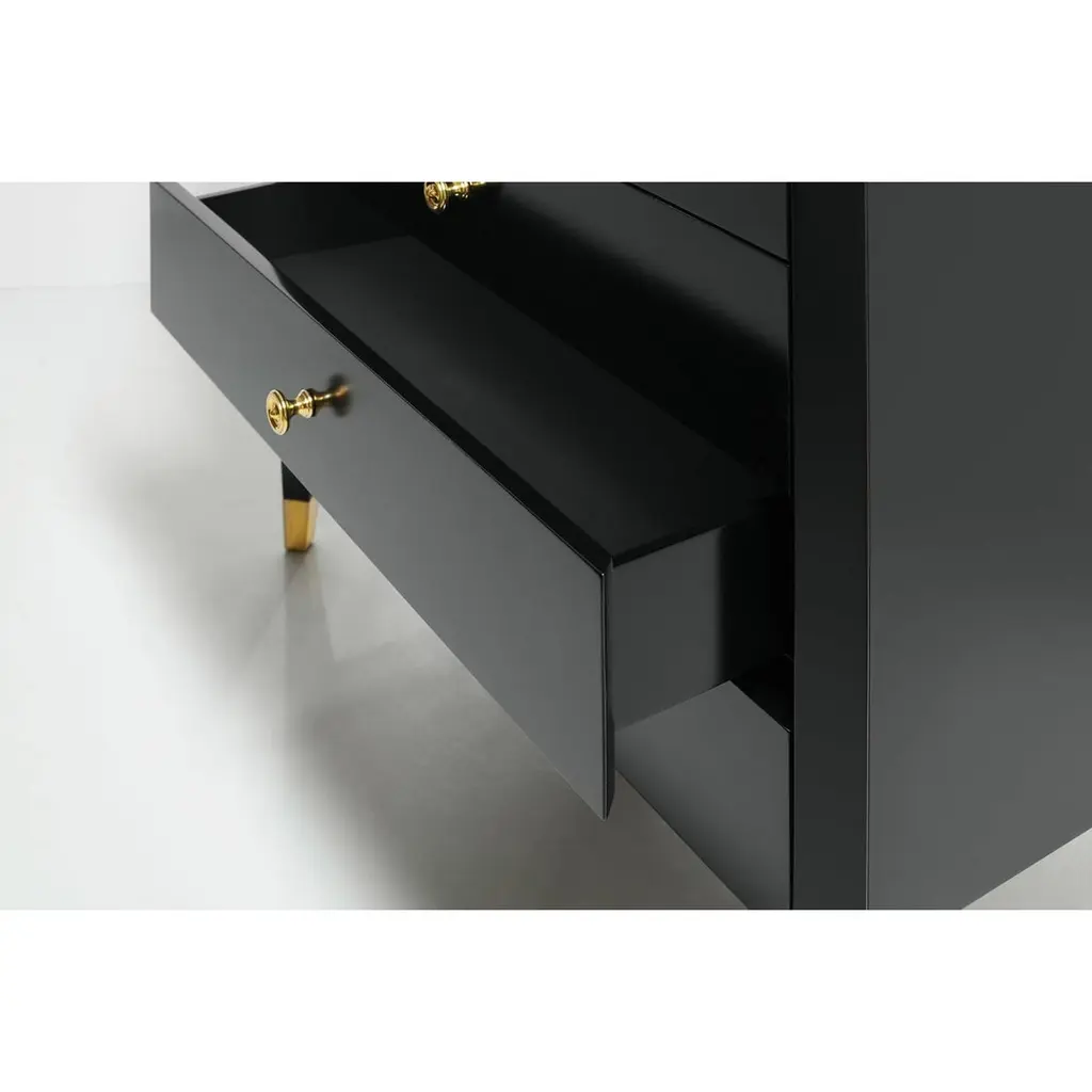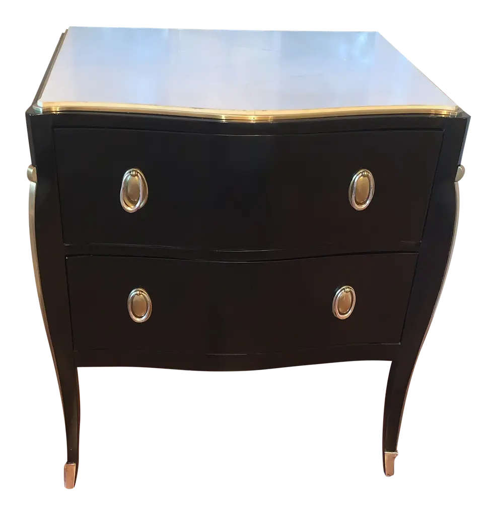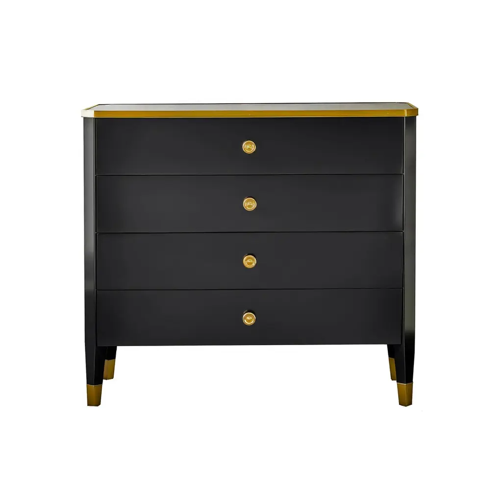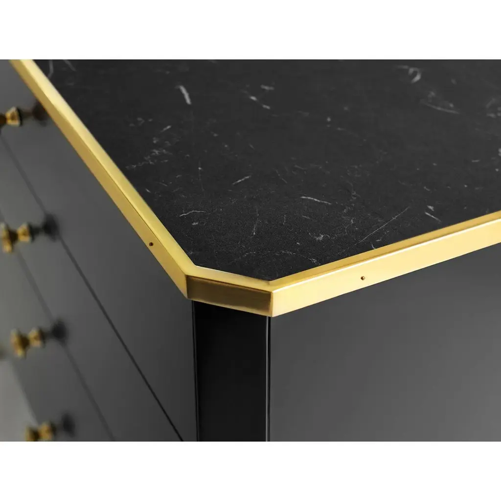 This sophisticated piece combines timeless style with practical features. Its sleek black lacquer finish is complemented by a luxurious marble top and adorned with brass accents and hardware, creating a striking contrast that exudes opulence.Featuring four spacious soft-close drawers, this nightstand offers a perfect blend of functionality and elegance, ensuring smooth and quiet operation. Whether used as a statement piece in your bedroom or as a chic accent in your living space, this nightstand enhances your decor with its timeless charm and artisanal craftsmanship.Dimensions: 37" W x 18.5" D x 33" H