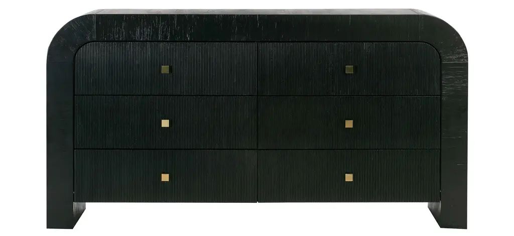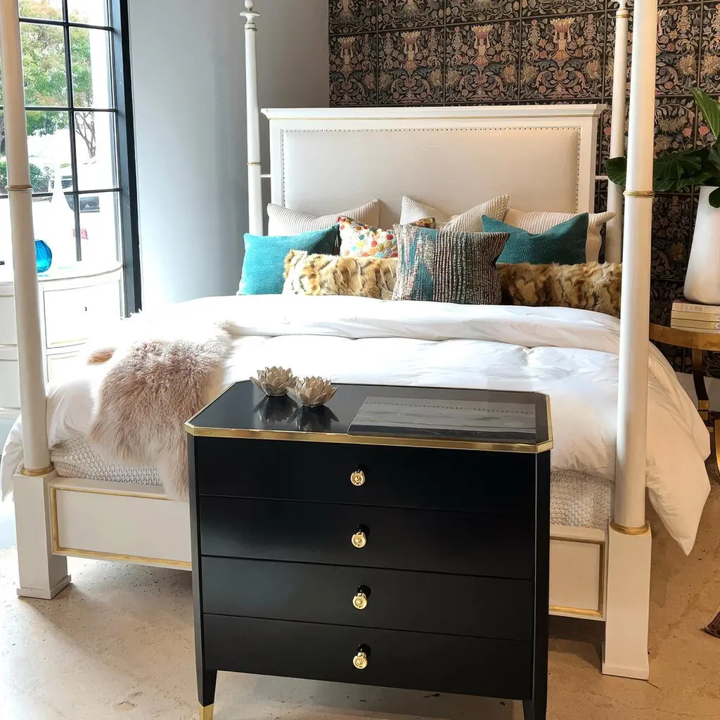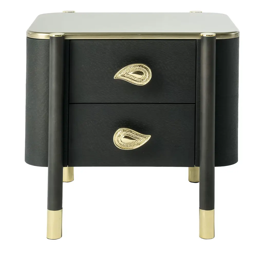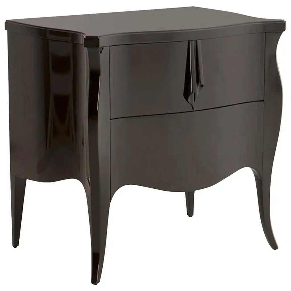 This sophisticated piece combines timeless style with practical features. Its sleek black lacquer finish is complemented by a luxurious marble top and adorned with brass accents and hardware, creating a striking contrast that exudes opulence.Featuring four spacious soft-close drawers, this nightstand offers a perfect blend of functionality and elegance, ensuring smooth and quiet operation. Whether used as a statement piece in your bedroom or as a chic accent in your living space, this nightstand enhances your decor with its timeless charm and artisanal craftsmanship.Dimensions: 37" W x 18.5" D x 33" H