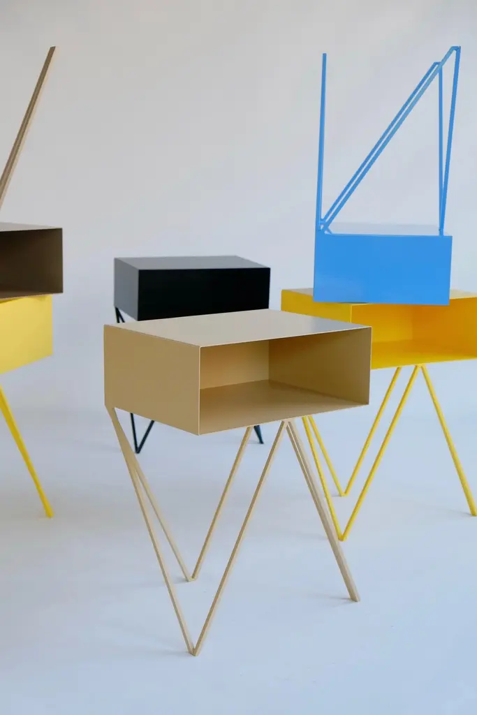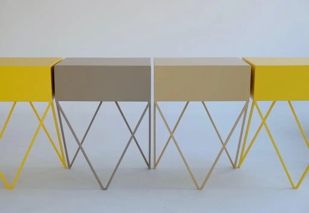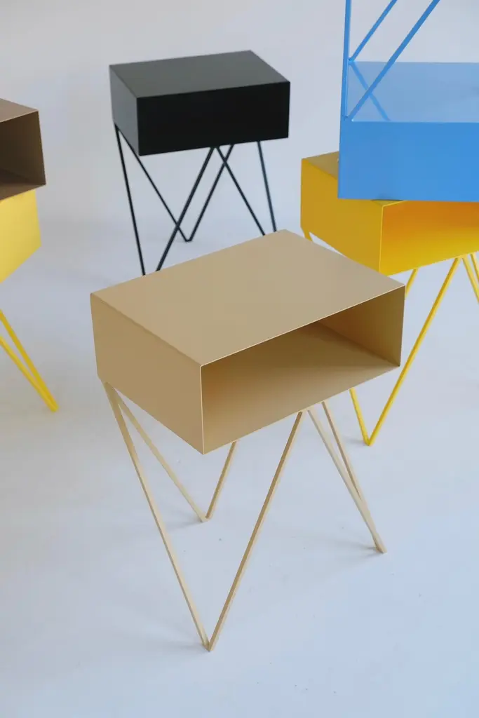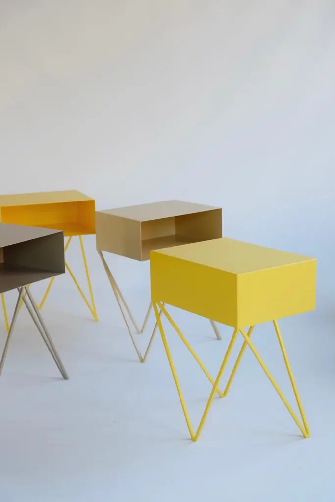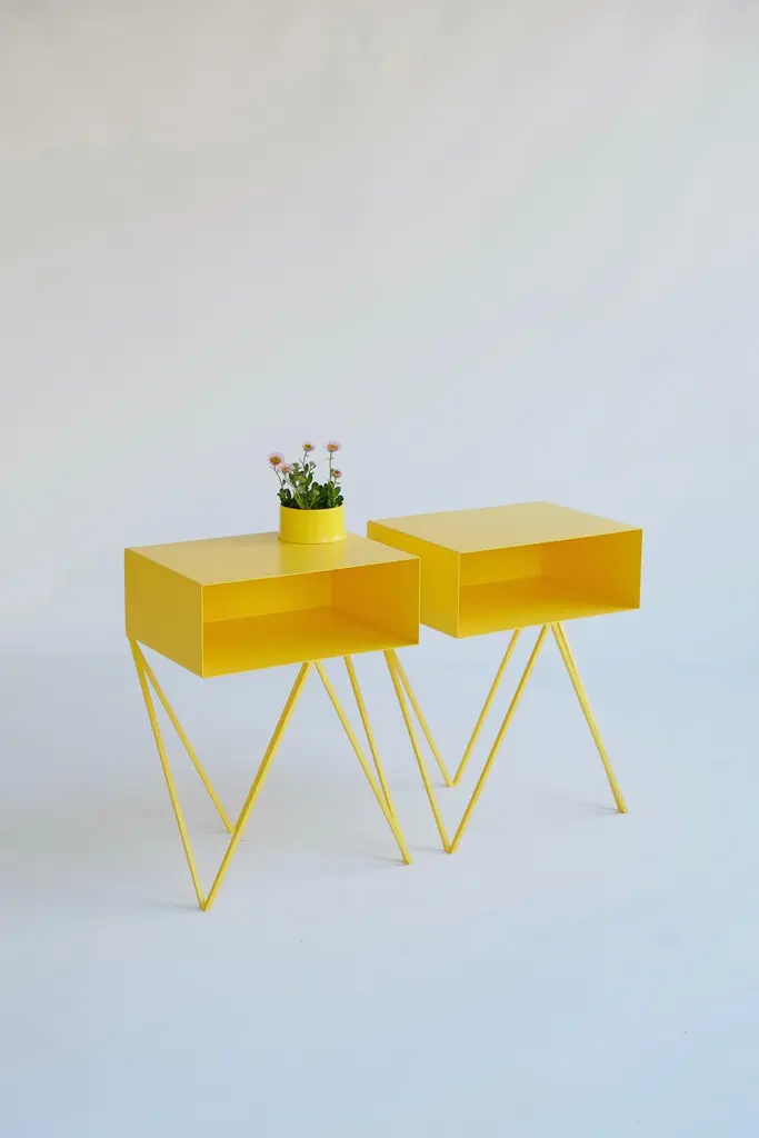 A beautiful pair of butternut beige Robot bedside tables. The Robot side table features an open shelf on zig zag legs. A fun and functional design made of solid steel, powder-coated in yellow. The clean lines look great against period details as well as in modern spaces. Perfect as a bedside table. Available in fifteen colours. This price is for one pair. &New is an award winning design studio founded by Finnish and British duo Mirka Gröhn & Jo WiltonDistinctly modern with elegant lines, &New's core steel furniture collection is recognizable by it's minimal powder-coated form. The airy designs combine an aesthetic of British wit and Nordic simplicity. Colour samples available to order from our storefront - LU2894331610202 Measurements 45cm wide, 33cm deep, 60,5cm high. 17cm high inside the shelf. Bespoke sizes and colours available. Worldwide delivery available - shipping includes custom made plywood boxes.Mirka and Jo &New Modern British FurnitureZig-zag-legs/ Registered design. Community design registration number: 002391813-0001.