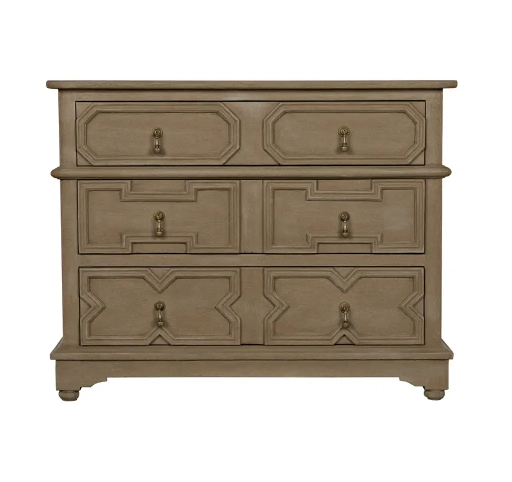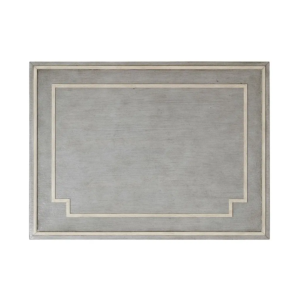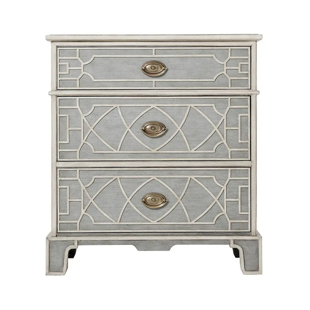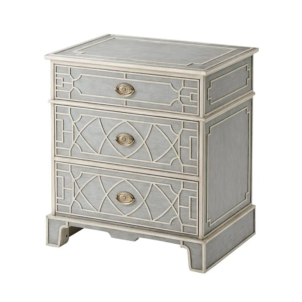 A Chinese Chippendale style grey limestone painted bedside chest of drawers, the rectangular paneled top, and sides above four blind fret paneled drawers, on similar bracket feet. Dimensions: 27" W x 20" D x 27" H.The listing is for TWO nightstands.