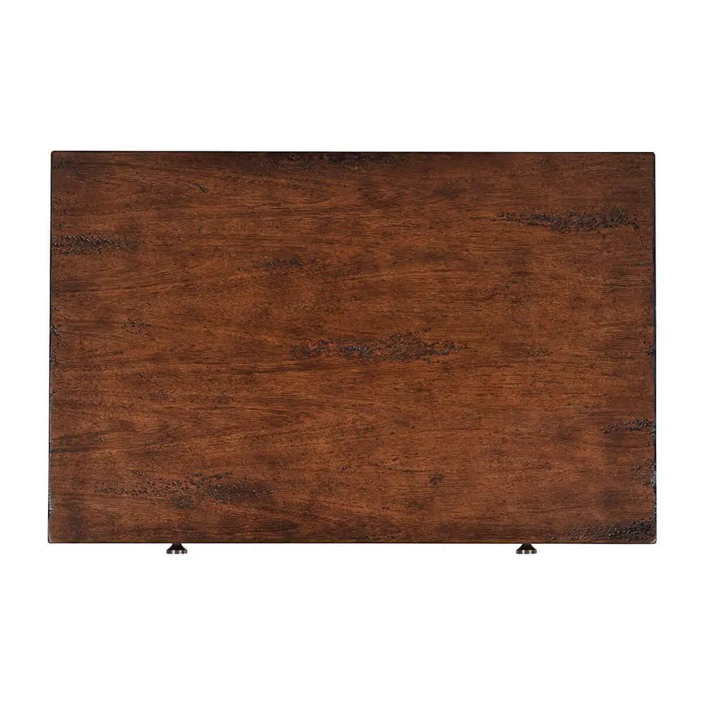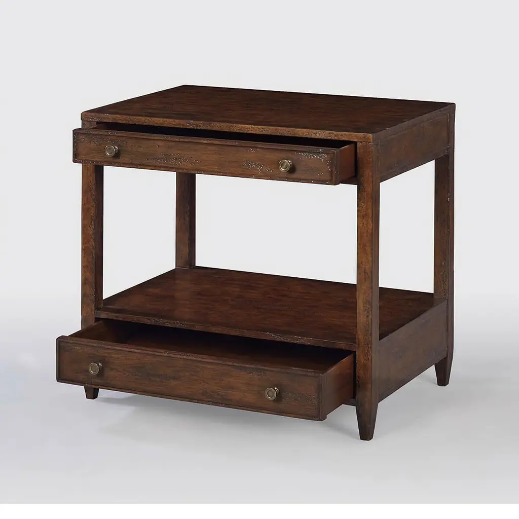Classic nightstand - A wide rectangle side table with two drawers, brass hardware, and tapered feet, with a “country” dark mahogany tone with natural highlights, a hand-rubbed and distressed antiqued finish.Dimensions: 28" W x 18" D x 26" H.