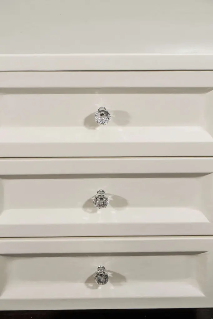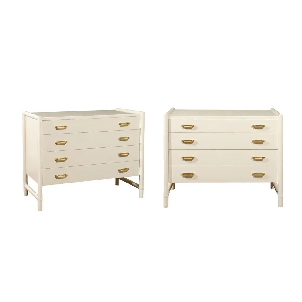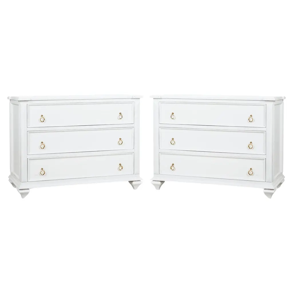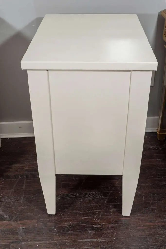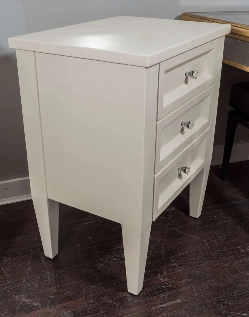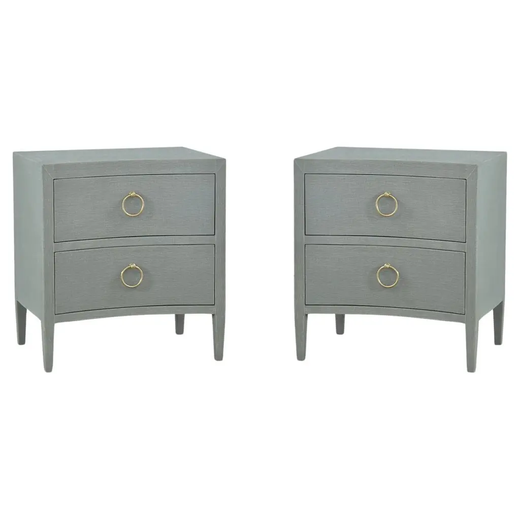 Pair of custom leather wrapped nightstands with three drawers. Customization is available in different sizes, colors and hardware.