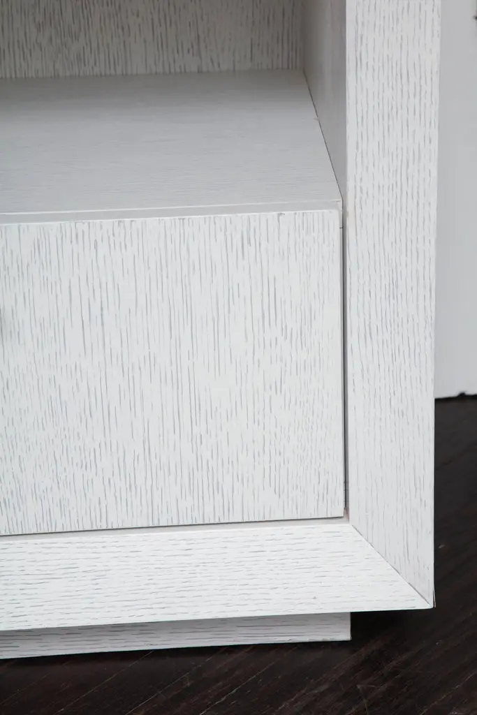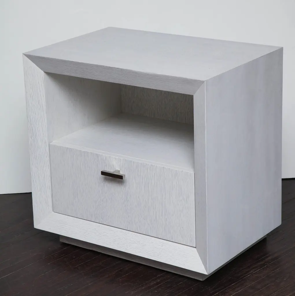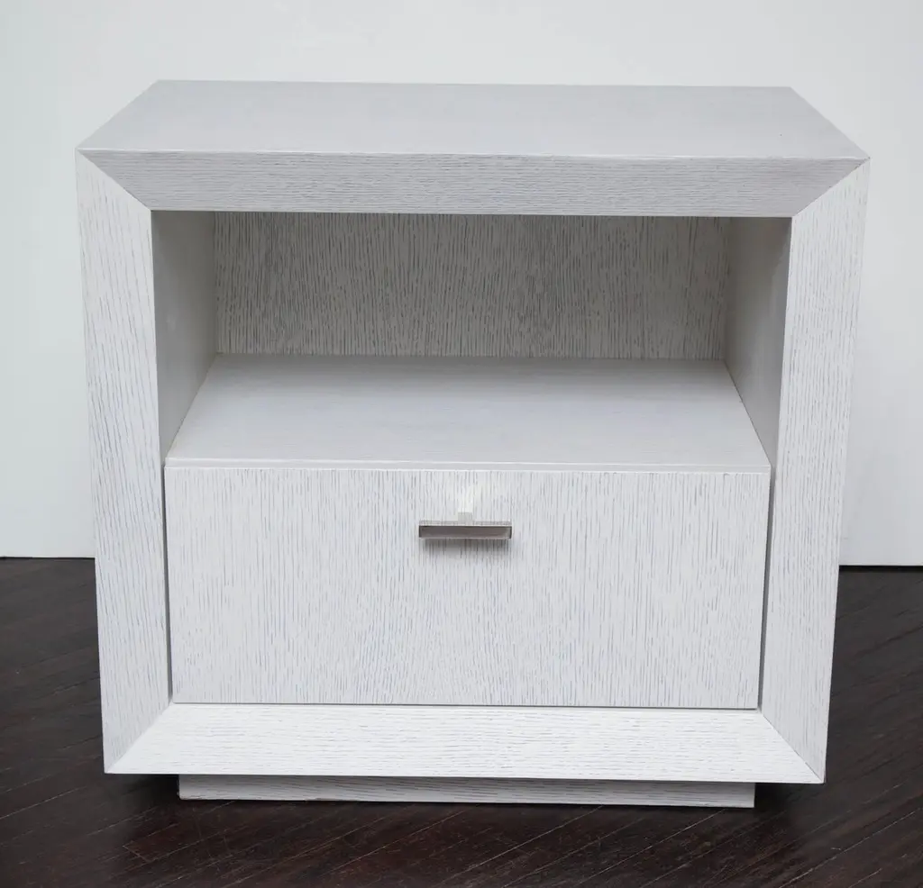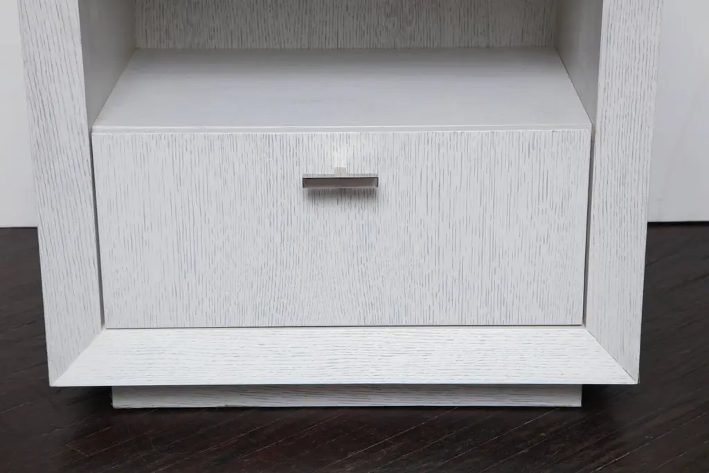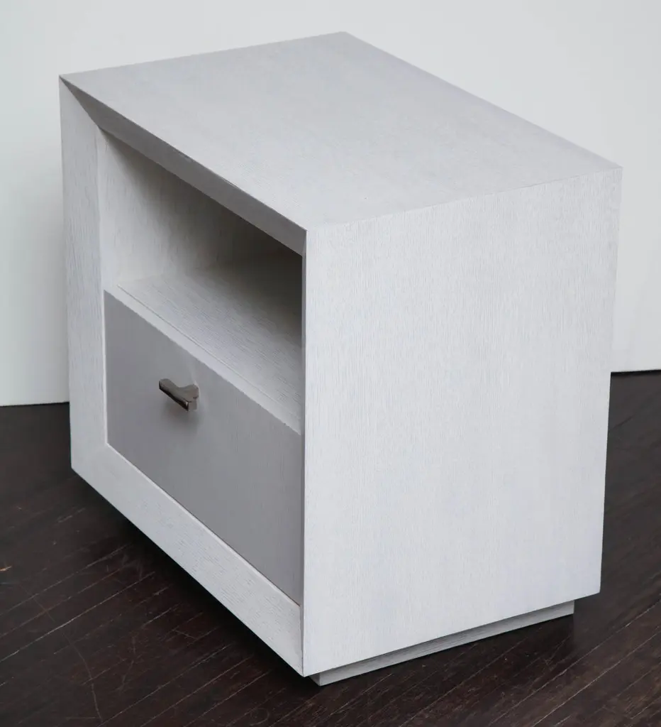 Pair of custom painted cerused wood nightstands with polished nickel pull. The drawer interior finish is shown in maple. Customization is available in different sizes, colors, interior finish, and hardware (Customer Owned Hardware).