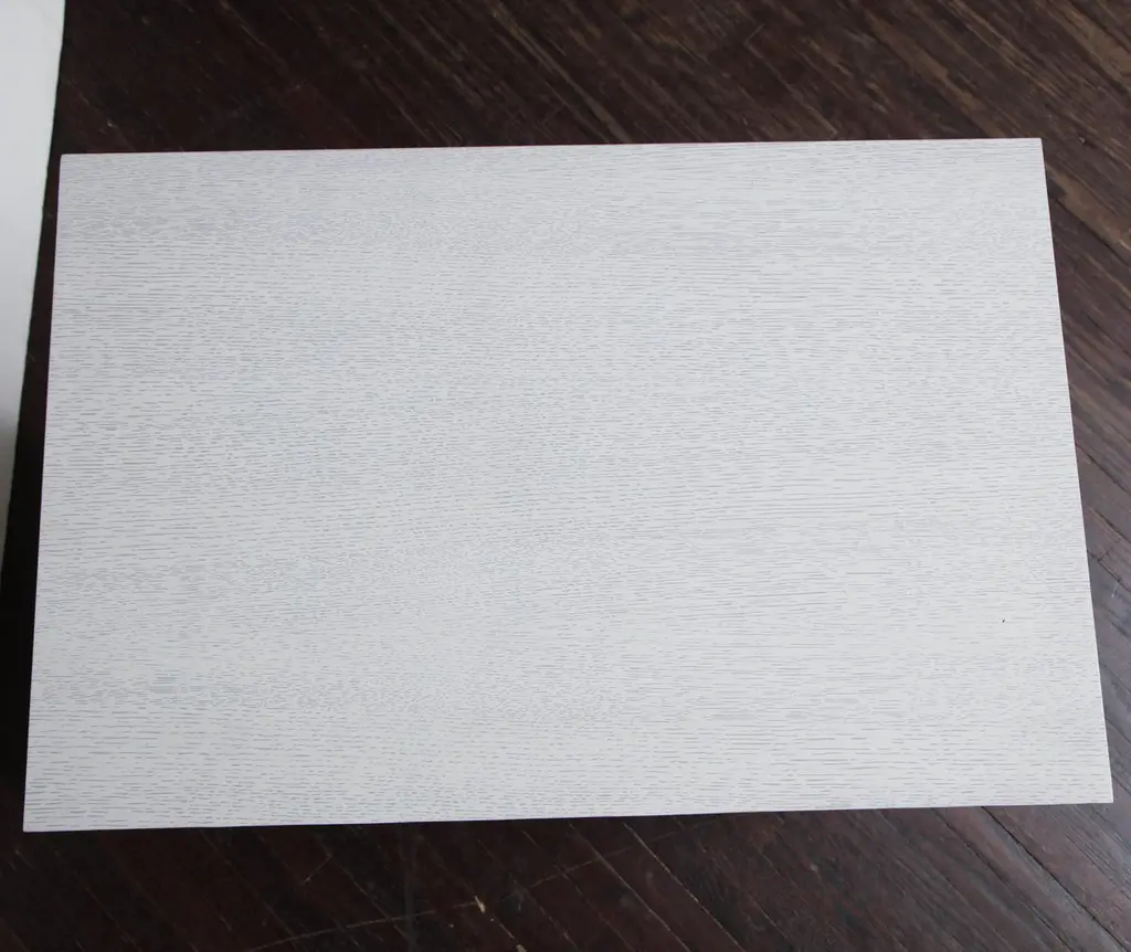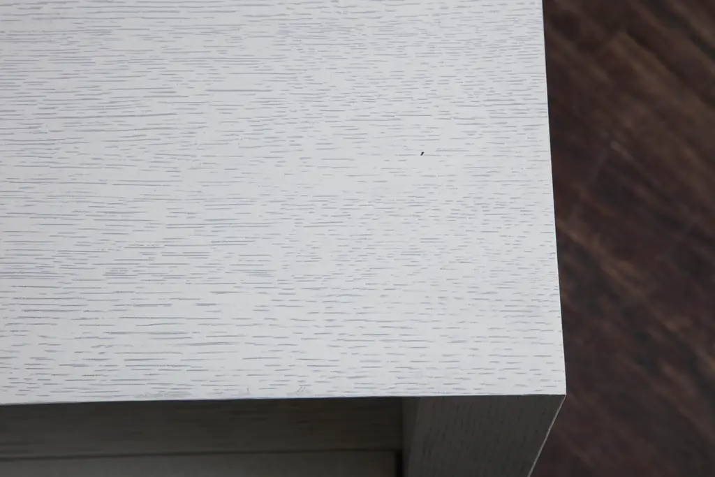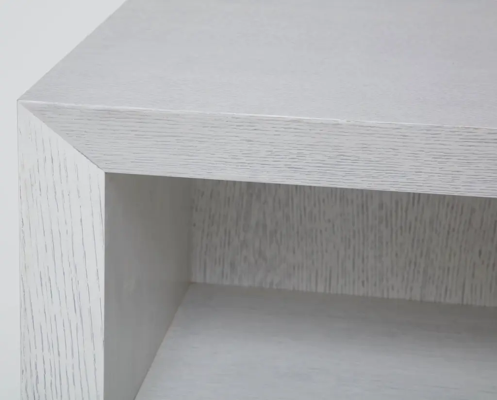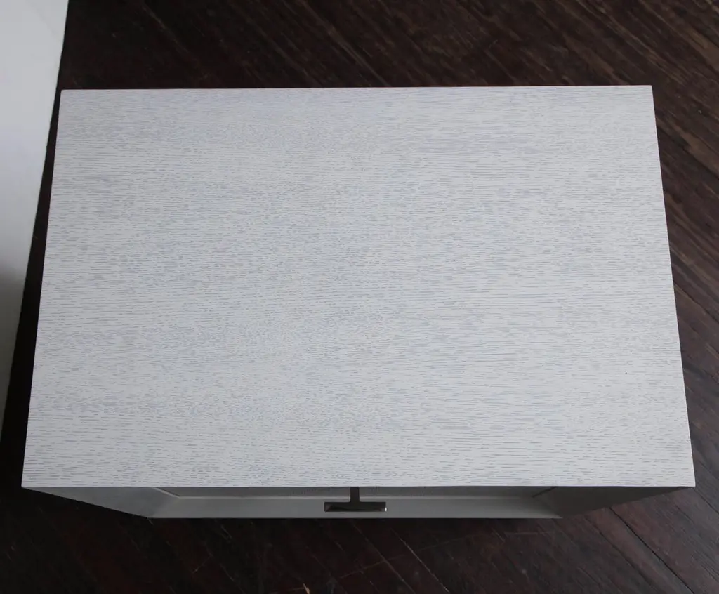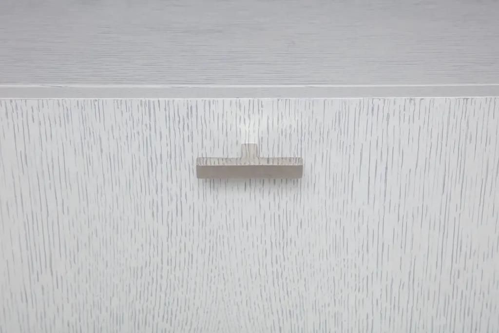 Pair of custom painted cerused wood nightstands with polished nickel pull. The drawer interior finish is shown in maple. Customization is available in different sizes, colors, interior finish, and hardware (Customer Owned Hardware).